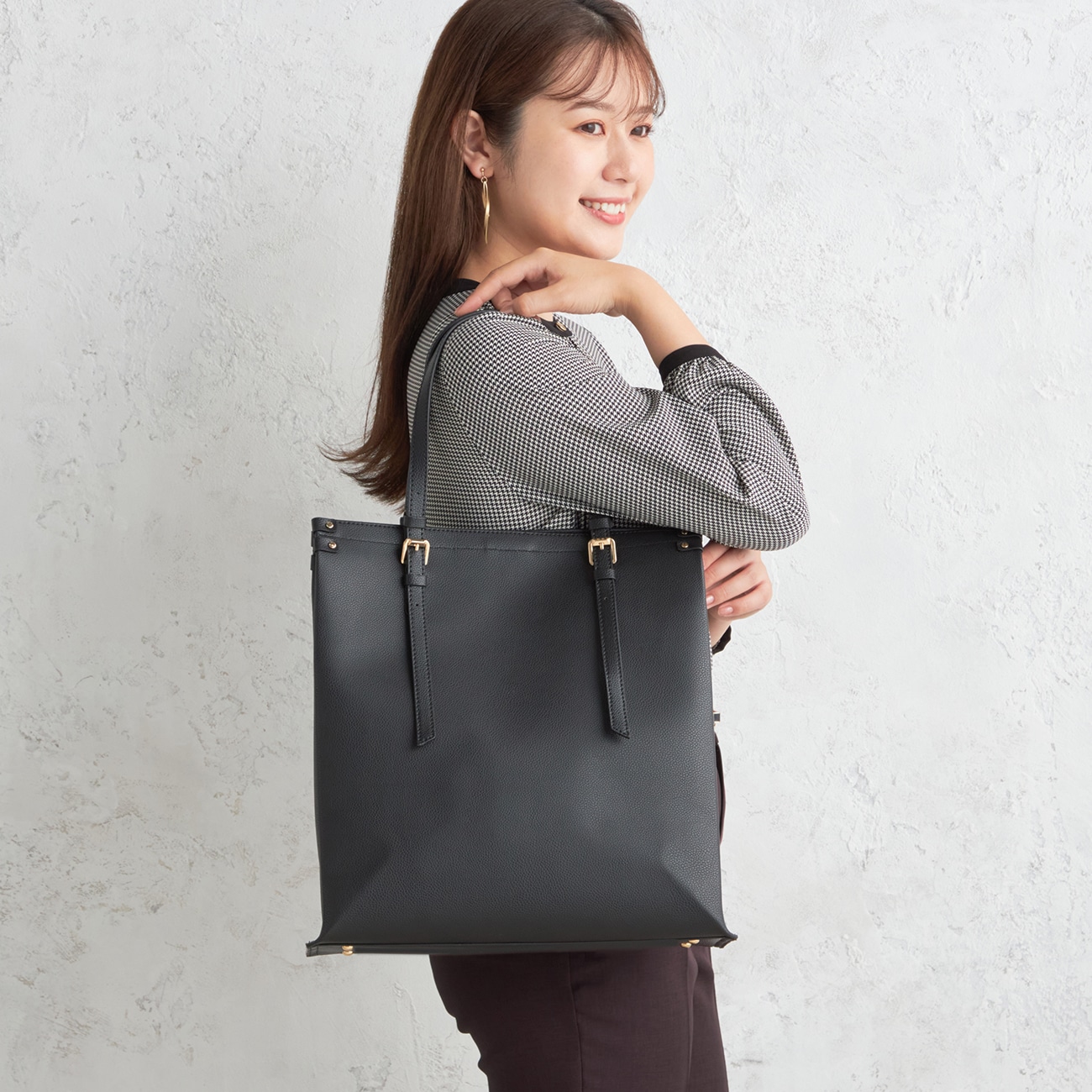 PC対応・A4サイズもしっかり収納 一枚仕立ての縦型バッグ、スタイリッシュながらも大容量◆企画者コメント◆横型が多いバッグのラインナップに、今期は「縦型」のバッグを新たに展開しました。マチもたっぷりで使いやすく、秋冬スーツにも合わせやすい黒とベージュの2色展開です。持ち手の長さが調節でき、金具が程よいアクセントになってオシャレ感UP!ぜひ一度お試しください〇軽くて柔らかい1枚仕立て仕様一枚の革で仕立てることで縫い目が少なく、体になじみフィットしやすいです。また底鋲が付いており自立するため、安定感もあります。〇A4資料も入る大容量サイズ内側のファスナーポケットはPC対応、さらに便利な収納ミニポケット付き。お弁当も入るマチの広さ、マイボトルやA4ファイルなど長さのある荷物を立てて入れられるのも嬉しいポイント◎--------------------▼カラー茶:肌なじみのよいグレージュに近い色味黒:ベーシックな黒金具(共通):ゴールド▼ポイント@ 一枚仕立てで軽く柔らかA 内側には便利なミニ収納ポケット付きB A4サイズもしっかり収納C 通勤や通学に邪魔にならないサイズ感ながらお弁当箱やマイボトルもしっかり入るD 底鋲付の自立型で床に置いても安心