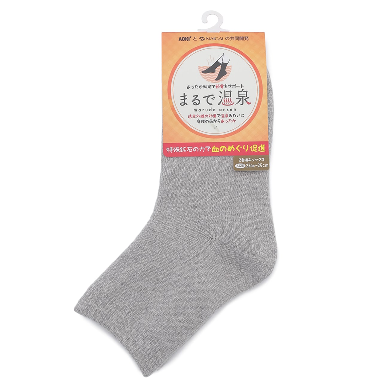 冬の寒さと節電対策に!遠赤外線の力を活かした「まるで温泉」2重編みソックス◆企画者コメント◆AOKIとNAIGAIで共同開発した、あったか効果で節電をサポート「まるで温泉」シリーズ新登場です!遠赤効果でまるで温泉や足湯につかっているような温かさが持続する2重編みソックスです。〇遠赤外線が血行を促進プリントされた「テラヘルツ鉱石」が放つ遠赤外線は、血行の促進が期待できます。※本品自体に発熱する機能はありません。〇温かさの秘密「足先」を、2重編みの保温力と血の巡りを促進する特殊な鉱石プリント(足裏に使用)のチカラでまるで温泉につかっているような温かさが持続します。〇冬のあったか節電アイテム快適に過ごしながらも光熱費をカットできる。電気を使わないから場所を選ばず寒さ対策ができるのも魅力。寒さを感じたらさっと履くだけ!あったか冬のイチオシアイテムです。--------------------▼機能〇 洗える(洗濯機洗浄可)〇 保温