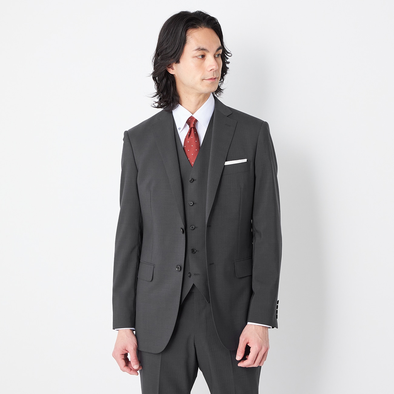 シルエットと着心地をアップデートしたLES MUES ブリティッシュスリム気になる汚れ・においも落とせます!幅広い用途で着回せる洗えるスリーピーススーツ〇スリーピーススーツビジネスからブライダル・フォーマルまで幅広い用途にお召しいただけるスリーピーススーツ。ベストを着用することで、よりドレッシーでフォーマルな装いにも対応でき、スーツの上品さとお洒落さを演出。〇洗えるスーツ仕事終わりに、休日に、洗濯機で簡単に洗えます。スーツは自宅で水洗いして、日々の汚れやにおい、菌やウイルスを洗って落とし、いつでも清潔に。洗濯後もほぼアイロンがけは不要で、お手入れらくらく。〇高いストレッチ性ストレッチ性の高い素材で動きやすく快適な着心地ながらもシワに強く、きちんと見えし好印象◎〇LES MUES(レミュー)ブリティッシュスリムのこだわりポイント・首から肩にかけて、より吸いつく襟の「のぼり」が美しく着心地も良し・ラペル幅をやや細くし、よりスリムな印象に・胸囲とウエストの差寸調整により、横しわ・つっぱり感がなくなり、より綺麗な見た目に・フロントカットを広めに設定し、軽快かつウエストシェイプした印象に・パンツのヒップ周りのしわ改善を実現し、より綺麗なシルエットに--------------------▼デザインナチュラルショルダーゆるやかに流れる曲線が美しいナチュラルショルダー。極薄毛芯パットの採用と、丸く縫う縫製技術で着用感も優れています。スマートシルエット適度な肩幅、ウエストをやや細く絞ったスマートシルエットのジャケット。コンフォート仕様パンツのウエストベルトを特殊な仕様にすることで快適な着用感を実現。テーパードパンツローライズで履きやすく、股上が浅く美脚効果の高いテーパードシルエットで、エレガントな佇まいを演出。--------------------▼仕様ジャケット:センターベント・背抜き裏地・マルチポケット付・AMFステッチパンツ:ノータック※ローライズパンツのため、お腹周りの圧迫が軽減されます。※お届け商品の付属タグに「ウエストの実寸は表示サイズより+2cmで仕上がっています」と記載がございますが、WEBページ上ではウエストサイズは元々+2cmで記載しておりますのでご安心くださいませ。▼生地の厚さ普通▼機能〇 洗える(洗濯機洗浄可)〇 ストレッチ(表地・胴裏・袖裏・膝裏)〇 プリーツ加工▼プリーツ加工とは長時間の着用や雨・水に濡れた時でも折り目が消えにくくなっています。着用後に折り目が消えかかっても、霧吹きして吊り下げておくと折り目が回復してきます。さらに軽くアイロン掛けすることでより一層シャープさが増します。クリーニングの際は取扱表示をご確認の上従い、必ず元の折り目に沿ってプレスしてください。--------------------※こちらは裾のお直しが必要な商品です。ミシンでの補正をご希望の場合は「お直しの選択」ボタンよりお選びください。またお急ぎの場合はアイロンで裾上げができる、裾上げテープもご用意しております。※本商品にはハンガーが付属します。保管用カバーは付属いたしませんのでご了承ください。お求めの方はこちら。