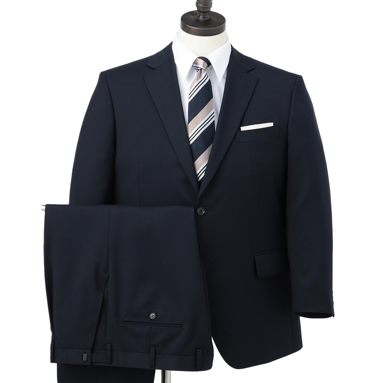 ビジネスから就職活動にまで使える紺無地スーツリサイクルポリエステル素材「エコペットプラス」使用〇リサイクル素材使用ケミカルリサイクルによって再生されたポリエステル繊維「エコペットプラス」を裏地に使用。石油から原料を作るのに比べ、エネルギーの使用量と二酸化炭素排出量を約1/5に抑えることができます。〇洗えるスーツ仕事終わりに、休日に、洗濯機で簡単に洗えます。スーツは自宅で水洗いして、日々の汚れやにおい、花粉・菌・ウイルスを洗って落とし、いつでも清潔に。洗濯後もほぼアイロンがけは不要で、お手入れらくらく。〇アジャスター付きスラックスはアジャスター付きでウエスト±6cm調節可能(ウエスト100cmの場合、最小94cm〜最大106cmまで調整できます)。------------------▼サイズ感ベーシック(当社比でゆったりめのサイズ ※当社比)▼仕様ジャケット:センターベント・背抜き裏地パンツ:ワンタック・アジャスター付き------------------▼機能〇 洗える(洗濯機洗浄可)〇 ウエストアジャスター付き------------------※こちらは裾のお直しが必要な商品です。ミシンでの補正をご希望の場合は「お直しの選択」ボタンよりお選びください。またお急ぎの場合はアイロンで裾上げができる、裾上げテープもご用意しております。※本商品にはハンガーが付属します。保管用カバーは付属いたしませんのでご了承ください。お求めの方はこちら。こちらの商品の自社旧価格は2023.08.07〜2023.09.03の期間の販売価格となります。