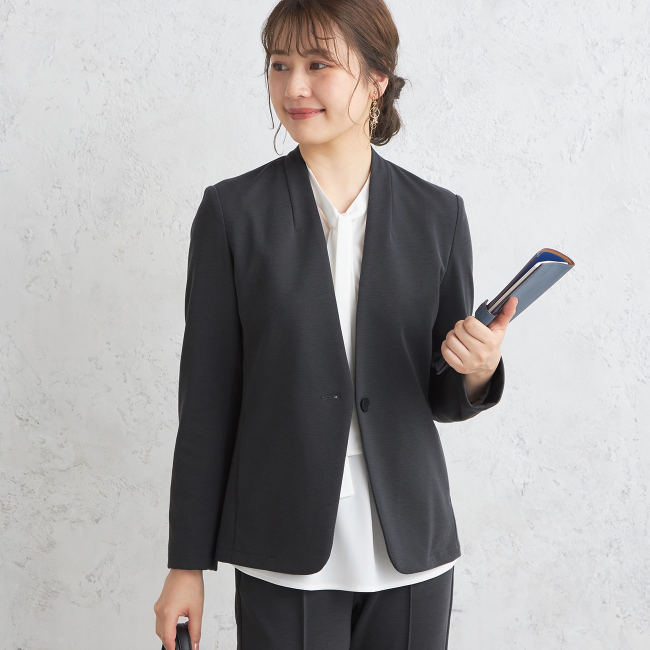 大人な雰囲気・上品仕上げのパジャマスーツ「見ためスーツ、着心地パジャマ」をコンセプトに、パジャマの快適さとスーツのフォーマルさを兼ね備えた「パジャマスーツ」シリーズ。〇ヒールにも、リュックにも合う万能ジャケット・シンプルなノーカラーデザインで顔まわりもすっきり、デコルテラインは美しく・さっと羽織ってカーディガン代わりにもおすすめ・通勤から学校行事、お食事会まで、カジュアルにもきれいめにも着回せる・別売りのスカートやパンツとセットアップでも着用可能〇ドレッシーな印象ジャージー素材・しっかりとした厚み、程よいハリ感、しっとり落ち感が美シルエット・ストレッチ糸を混紡し、着心地の良さも◎・経済的な自宅で洗えるウォッシャブル仕様--------------------▼仕様裏地なし、ポケットあり▼機能〇 洗える(洗濯機洗浄可)〇 ストレッチ※本商品にはテーラーバック・キャリーハンガーの付属はございません。--------------------▼セットアップシリーズ 別売り※クロップドパンツ以外は紺・黒のみの展開です。ジャケット(テーラード):品番23WLWLJK2スカート:品番23WLWLSK1パンツ(クロップド):品番23WLWLPT1パンツ(ワイド):品番23WLWLPT2--------------------▼スタッフ着用コメント@身長151cm 普段のサイズ:S/本商品着用サイズ:Sスタッフコーデはこちら「着丈はヒップ真ん中より下でやや長めです。袖丈は親指の付け根が隠れる長さです。肩幅は気持ち余裕ある感じです。しっかりめの生地感でストレッチも効いてて、見た目より動きやすいです。」A身長159cm 普段のサイズ:M〜L/本商品着用サイズ:Mスタッフコーデはこちら「着丈はヒップが3分の2隠れるくらい。やや長め。Sサイズでも着れますが冬はインナーにニットを着たいのでMサイズを選びました。適度なゆとりがあって すごしやすい。サイドにポケット付きで便利◎しっかりとした厚手の生地。10月から3月ごろまで着れそうな生地の厚さだと感じました。」B身長162cm 普段のサイズ:S/本商品着用サイズ:Mスタッフコーデはこちら「【サイズ感】・普段のサイズ選はSサイズです。・Mサイズでも問題なく着用できます。・腕周りに余裕がありますが、インナーに厚みのあるニットを着るならちょうどいいぐらいです。【素材感】・もちもち柔らかい生地の触り心地です。・しっかりとした厚みの生地です。・すごくストレッチがあって伸びます。」--------------------