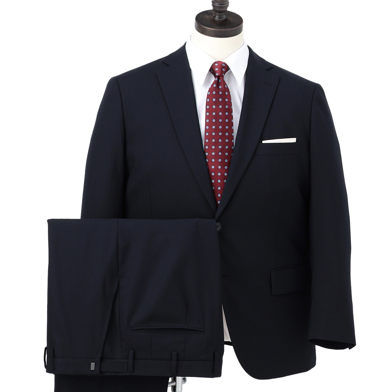 洗濯機で洗える!さりげなくおしゃれな紺のシャドーストライプ柄のウォッシャブルスーツ〇洗えるスーツ仕事終わりに、休日に、洗濯機で簡単に洗えます。スーツは自宅で水洗いして、日々の汚れやにおい、花粉・菌・ウイルスを洗って落とし、いつでも清潔に。〇スリムスタイル適度な肩幅、ウエストを細く絞ったスリムスタイルです。〇ウエストらくらく仕様パンツのウエストベルトに特殊な仕様とストレッチ芯を使うことで、ウエストストレッチの快適な着用感を実現しました。〇ストレッチ袖裏平滑性、ストレッチ性が高い裏地を使用。裏地のストレッチ性と連動して伸びるため、快適な着用感です。--------------------▼サイズ感スリム「LES MUESスマート商品」と比較すると、ジャケットは着丈・袖丈がやや長く、肩幅は狭くなっています。パンツについては渡り幅・膝幅・裾幅がやや大きくなっています。▼仕様ジャケット:センターベント・背抜きスラックス:ノータック・アジャスター付き※パンツのウエストにはアジャスターが付いており、左右±6cm幅で調整ができます。▼生地の厚さ普通▼機能〇洗える(洗濯機洗浄可)〇ストレッチ〇ウエストアジャスター--------------------※こちらは裾のお直しが必要な商品です。ミシンでの補正をご希望の場合は「お直しの選択」ボタンよりお選びください。またお急ぎの場合はアイロンで裾上げができる、裾上げテープもご用意しております。※本商品にはハンガーが付属します。保管用カバーは付属いたしませんのでご了承ください。お求めの方はこちら。こちらの商品の自社旧価格は2023.08.07〜2023.09.03の期間の販売価格となります。