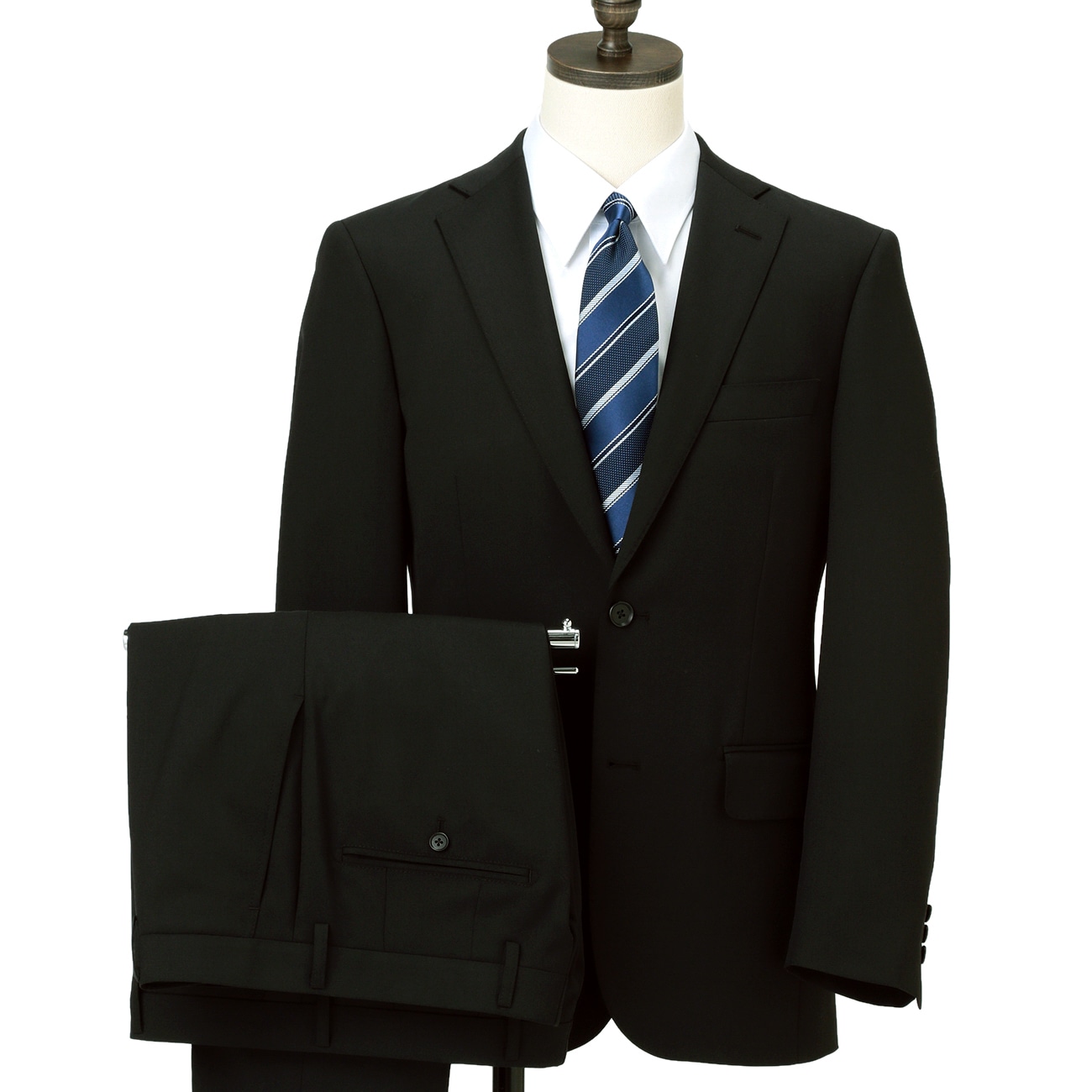 ビジネスから就職活動にまで使える、洗える黒無地スーツストレッチで着心地らく・パンツが2本セットになっており洗い替えに便利ナチュラルショルダーゆるやかに流れる曲線が美しいナチュラルショルダー。極薄毛芯パットの採用と、丸く縫う縫製技術で着用感も優れています。スマートシルエット適度な肩幅、ウエストをやや細く絞ったスマートシルエットのジャケット。コンフォート仕様パンツのウエストベルトに特殊な仕様とストレッチ芯を使うことで快適な着用感を実現。テーパードパンツローライズで履きやすく、股上が浅く美脚効果の高いテーパードシルエットで、エレガントな佇まいを演出。機能・洗える・通気性・消臭・軽量・2wayストレッチ・防しわ・プリーツ加工・前肩縫製・花粉ブロック・静電気防止--------------------※こちらは裾のお直しが必要な商品です。ミシンでの補正をご希望の場合は「お直しの選択」ボタンよりお選びください。またお急ぎの場合はアイロンで裾上げができる、裾上げテープもご用意しております。※本商品にはハンガーが付属します。保管用カバーは付属いたしませんのでご了承ください。お求めの方はこちら。こちらの商品の自社旧価格は2023.08.07〜2023.09.03の期間の販売価格となります。