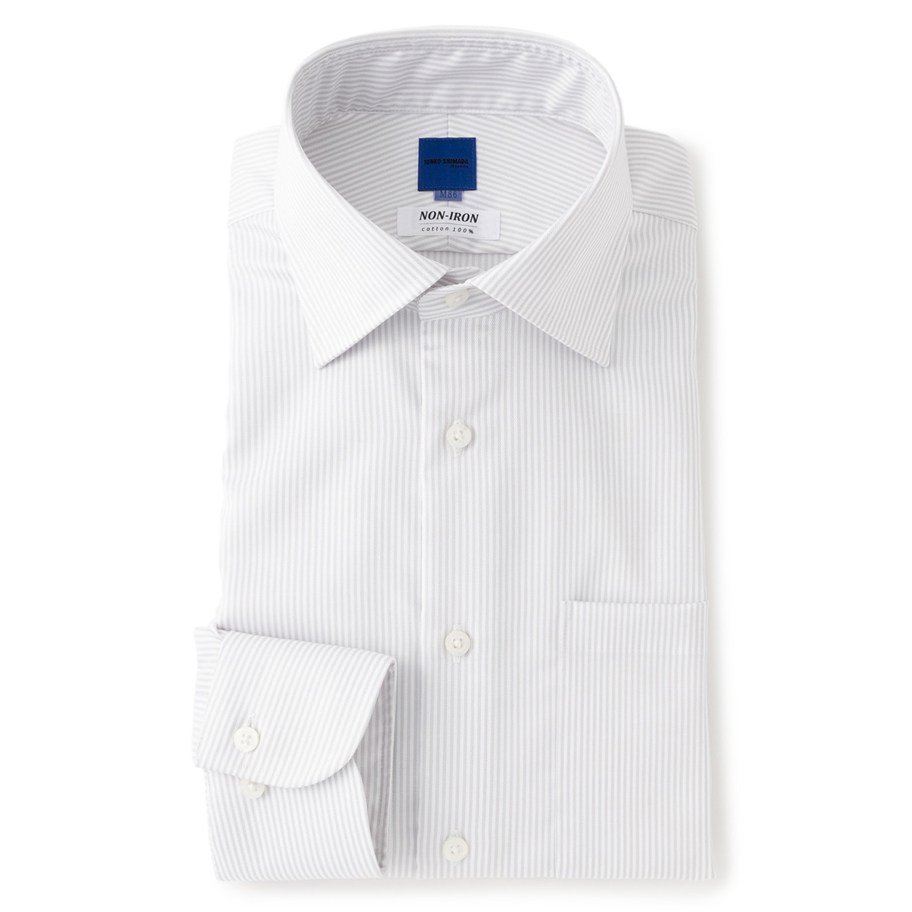 デザイナー島田順子が提案する「大人のための上質なスタイリッシュブランド」JUNKO SHIMADA JS homme〇綿100%で柔らかな肌触り綿の特徴である、柔らかな肌ざわりをお手入れ簡単ノンアイロンシャツで実現。身につけていても心地良く快適に過ごせます。〇ノンアイロンノンアイロンのため洗濯後もアイロンいらずでお手入れが楽です。ネットに入れて洗濯機で洗って干すだけ、いつでもキレイをキープ!〇縫い目のしわも軽減し快適な着用感を実現気になる縫い目のシワもインターロック縫製をかけることで軽減。さらに快適な着用感を実現するために肩回りはテープ縫製。〇ワイドカラーデザイン襟が程よく開いたワイドカラーシャツは、首元をすっきりと見せてくれます。ネクタイの結び目が良くみえるため、ウィンザーノットなどで結び目を大きくするとバランスがとれておすすめです。--------------------▼機能〇 ノンアイロン〇 綿100%〇 立体パターン--------------------【お取り扱い時の注意事項】※本商品はノンアイロンでお召しいただけますが、購入時のたたみジワが気になる場合は軽くアイロンをおかけください。※洗濯はシャツのサイズに合った洗濯ネットに1枚ずつ軽くたたんで入れ、脱水時間を短めに設定し、脱水後はすぐに干していただくときれいにシワが伸びます。※本商品は着用時に襟が綺麗に収まるように厚めのカラーステイを使用し、脱着式になっております。お洗濯の際に紛失する恐れがありますので、お洗濯の際にはカラーステイを外してください。また、万が一紛失された場合は同封の予備をご利用ください。--------------------▼おすすめネクタイスーツやジャケパンなどのインナーに最適。襟型も端正な印象でタイドアップが特におすすめです。ピッチの細かいストライプは印象も強くならず品良く着ていただけ、様々な色柄のネクタイとの組み合わせができる定番の1着です。--------------------