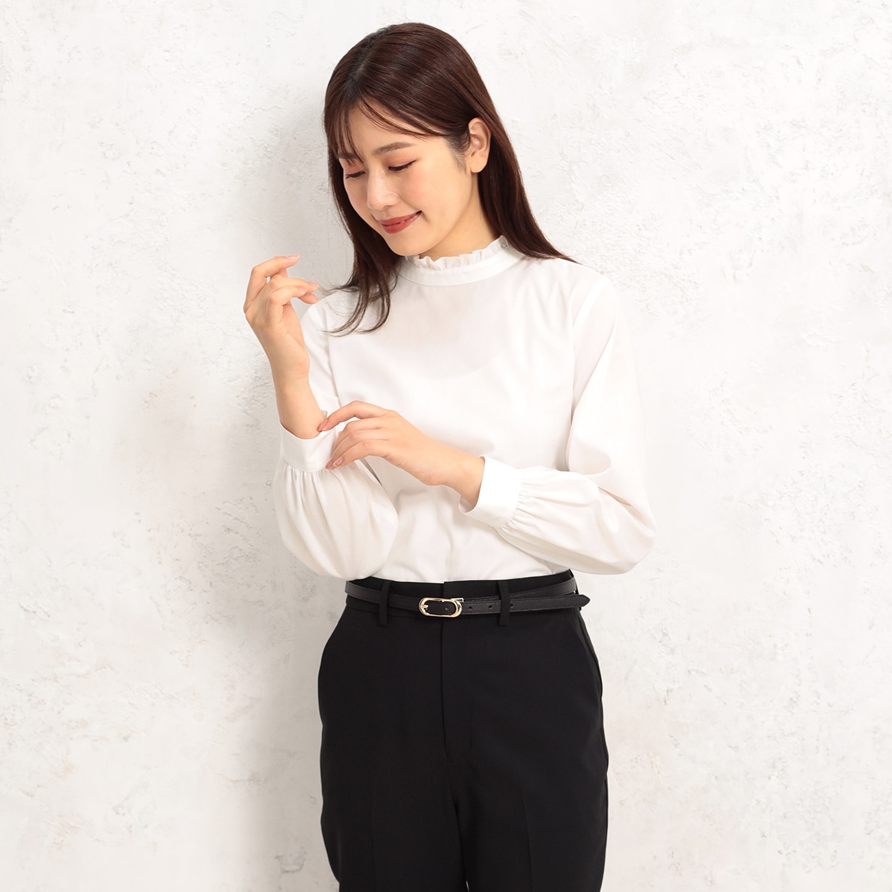 襟先のミニフリルが大人カワイイ〇オン・オフで着回しができるデザインスタンドカラーの襟先に可愛らしいミニフリルをあしらったデザインシャツブラウス。程よいゆとりのリラックスシルエットで、レイヤードスタイルも決まります。オフィスカジュアルにも、休日に1枚で着用しても様になるデザイン。首後ろの2つボタンがアクセントで後ろから見てもかわいいデザインです。〇シャツに嬉しい機能柔らかソフトタッチ素材使用で着心地バツグン。秋冬に嬉しい静電気低減テープ付きです。--------------------▼仕様透け感…あり裏地…なし伸縮性…なし光沢感…なし生地の厚さ…しっかりとした生地感▼機能〇 洗える(洗濯機洗浄可)〇 柔らかソフトタッチ生地で着心地快適〇 イージーケアでお手入れ簡単〇 静電気低減テープ付き--------------------▼スタッフ着用コメント@身長154cm 普段のサイズ:M〜L/本商品着用サイズ:Mスタッフコーデはこちら「透けますので肌着必須です。私はブラウス13号のバスト周りなので、バスト周りぴったりでした。サイズを上げると袖が長すぎるのでMにしました。きつくはないですが、ぴったりでした。バスト周り以外はゆとりあるサイズ感で、着丈も長めなのでおしりがすっぽり隠れます。デニムや、スキニーに合わせてもかわいいですね。いつものサイズでよいと思います。」A身長159cm 普段のサイズ:M〜L/本商品着用サイズ:Mスタッフコーデはこちら「いつものサイズ選びで大丈夫です。ストレッチはきいていないので少し脱ぐのが大変でした。首周りもチクチクせず ソフトな肌触り。ボトムアウトで着ても、もたつかない丈感がgoodです。濃いめのインナーは少し透けますのでスキンカラーをお勧めします。」B身長162cm 普段のサイズ:M〜L/本商品着用サイズ:Mスタッフコーデはこちら「いつものサイズで大丈夫です。イン・アウトどちらも使いやすくパンツ・スカートどちらでも合わせやすい◎生地はしっかりしていて高見えします!」--------------------
