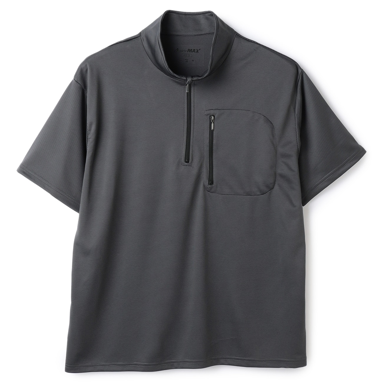 大好評のアスリートMAXシリーズに機能性抜群のTシャツが新登場!「スポーツにも!カジュアルにも!いつでも万能な1着!」@素早く吸水!素早く拡散!高い吸汗速乾性!A紫外線遮蔽率 90 %以上のUVカット!B抗菌防臭加工生地により夏の嫌な臭いをシャットダウン!C首の出し入れしやすい長めのフロントファスナーDフロントポケットは運動しても落としにくいポケットファスナー使用生地は表面がマイクロボーダー柄、裏面がメッシュ編みの二重編み生地を採用することで、肌面は点タッチによりべとつきにくくサラっとした着心地。夏に必要な機能満載の1着です。--------------------▼機能〇 洗える(洗濯機洗浄可)〇 吸汗速乾〇 抗菌防臭〇 UVカット