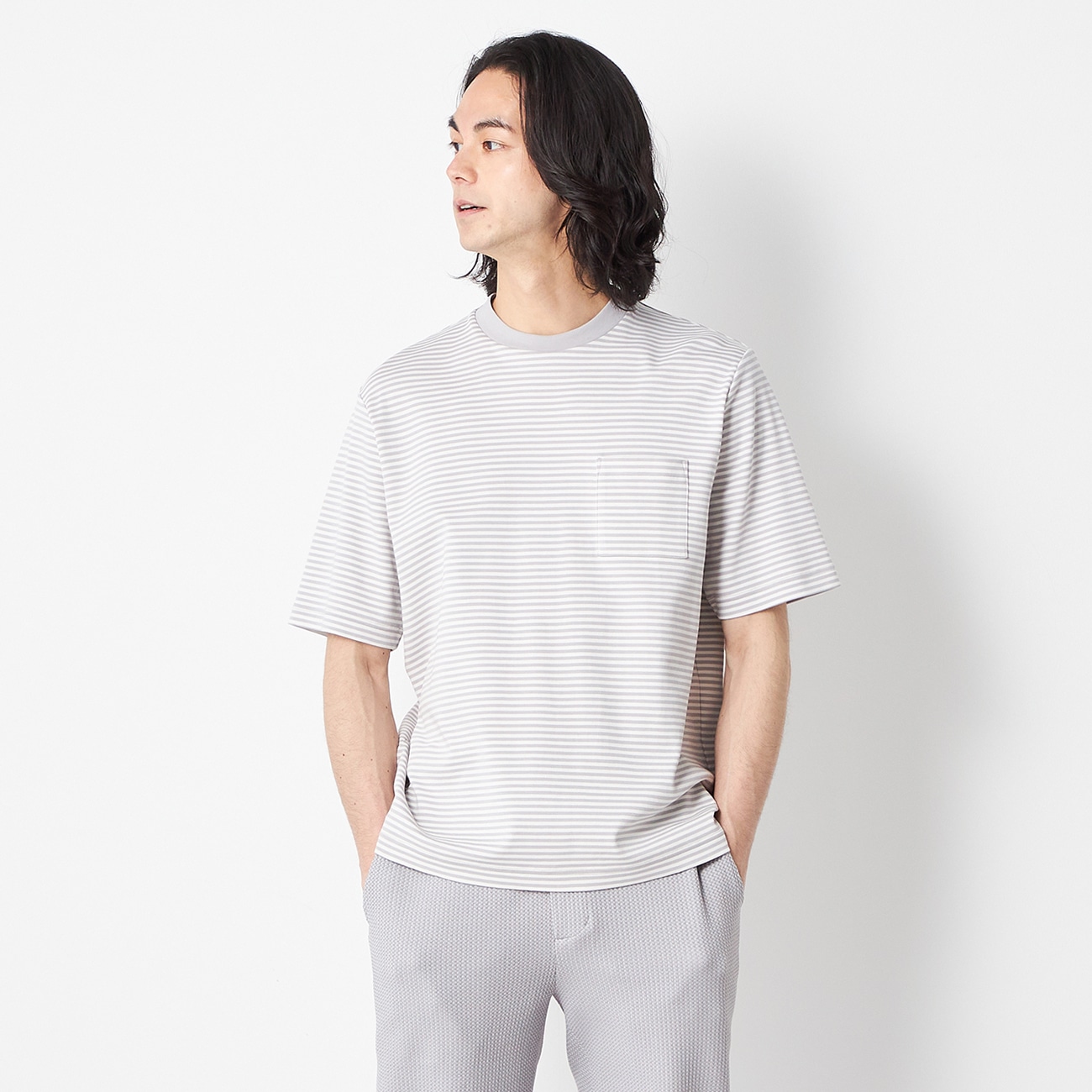 スーツ屋が仕立てたこだわりTシャツシリーズ累計販売着数55,000着突破した人気シリーズ『スーツ屋の仕立てたTシャツ』夏バージョンが登場!--------------------〇アップデートした「スロープネック」お客様のお声から社員が試着・洗濯を重ね、ヨレにくい襟に改良しました。後ろ襟にステッチを入れることで、首回りがヨレにくくなり、高いフィット感を実現し、きちんと感を高めました。〇ジャケットインナーとして最適ジャケットやパジャマスーツのインナーに着てもかさばらない、ダブつかない、スッキリとした着心地で相性抜群。襟の後のみを高くしたスロープネック仕様で、上着を着た時の首あたりと汚れにも配慮したデザインです。〇夏に使いやすいボーダー柄でコーディネートの幅が広がる綿100%スムース生地を使った上品な光沢・ハリ感がありジャケットのインナーに最適なきちんと感があります。ビジネスに最適な定番カラー。細ボーダーは一番着こなしやすく、コーディネイトにメリハリを出し、きれいめな印象で幅広く使えます。〇夏仕様の素材感素材自体の自然な接触冷感性が優しいひんやり感で心地良く、消臭機能も付与しており、いつでも清潔にお召しいただける一着です。--------------------▼機能〇 洗える〇 綿100%〇 接触冷感(暑い時期も心地よく着られる)〇 消臭(気になる匂いを軽減)--------------------【お取り扱いのご注意】色あせ、変色の原因となりますので、保管の際は直射日光や蛍光灯に当たる場所はお避け下さい。--------------------▼スタッフ着用コメント@身長167cm 普段のサイズ:M/本商品着用サイズ:Mスタッフコーデはこちら「●着心地-生地がサラッとした柔らかさなので暑い中でも不快感を軽減してくれます!-体感袖口が広めな為、熱が逃げてくのもgood!-肌に直接or肌着1枚でも窮屈さは感じず、抜群でした。」A身長169cm 普段のサイズ:M/本商品着用サイズ:Mスタッフコーデはこちら・標準的なシルエット。・普段のTシャツのサイズ感で大丈夫。・肩幅/丈感はジャストなサイズ。小さめに着てしまうと体のラインを拾います。・柔らかな生地感。・動きやすい優しい着心地。・細目のボーダーが優しい雰囲気。B身長173cm 普段のサイズ:L/本商品着用サイズ:Lスタッフコーデはこちら「前回シリーズからさらにアップデート。後衿にステッチを入れることで、首回りがヨレにくくなりました。綿100%で肌触り良く、接触冷感で快適に着こなせますよ♪上品な光沢・ハリ感があるので、ジャケットインナーにも着れる超便利なアイテムでおすすめです♪」