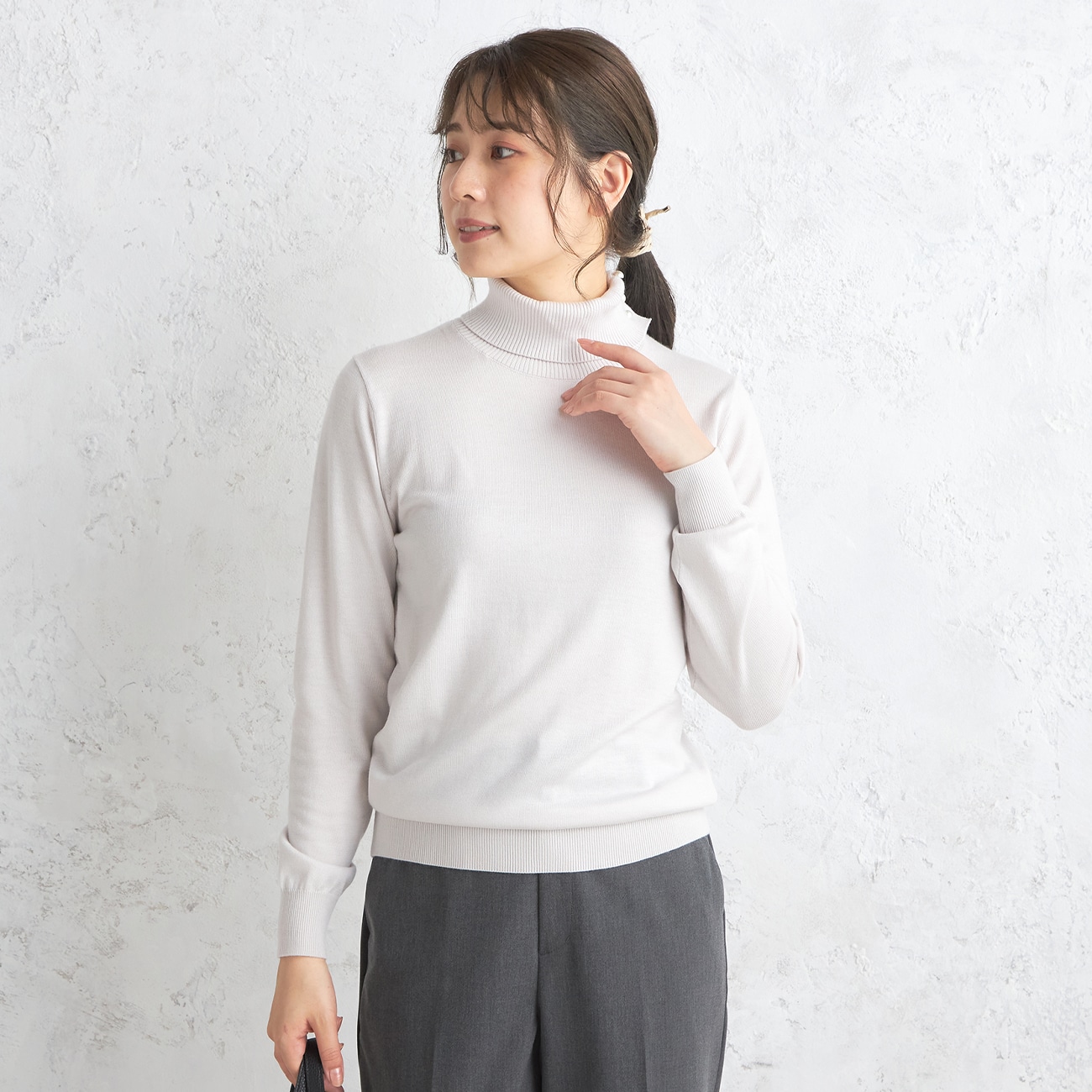 首にピタッとしすぎない襟が快適。温かみのある素材のタートルネック◆企画者コメント◆しなやかさを保ちつつ、気持ち厚手の編地に仕上げました襟は首にピタっとし過ぎず、窮屈さを感じさせないよう組織を変えています。肌あたりが優しく温かみも感じられる素材を使い、毛羽立ちを抑えてクリアな表面感に仕上げています!〇こだわりが詰まったデザイン・首元までしっかりあたたかいタートルネック・ややフィット感のあるシルエットですっきり見え・暖かさがありながら程良く薄手の柔らかい生地感・トップスだけでなく、シャツのインナーなどレイヤードスタイルも楽しめる〇洗えて静電気も抑制洗濯機で洗える仕様。静電気低減テープが付いており、冬の乾燥にも配慮。--------------------▼仕様透け感...なし裏地…なし伸縮性…あり光沢感…なし生地の厚さ…やや厚め生地感...柔らかで着心地の良い素材▼機能〇 洗える(洗濯機洗浄可)〇 静電気低減--------------------▼スタッフ着用コメント@身長159cm 普段のサイズ:M/本商品着用サイズ:Mスタッフコーデはこちら・ジャケットの下にも着れるちょうど良い生地の厚さ。・首あたりはチクチク感なく 柔らかい肌触り◎・アウトで着ても もたつかない丈感なので裾を入れても出しても楽しめますA身長162cm 普段のサイズ:S/本商品着用サイズ:Sスタッフコーデはこちら・やわらかい生地で肌触りが良いです◎・ちくちく感なく、ナチュラルなストレッチ感を感じます。・透け感はないです!--------------------
