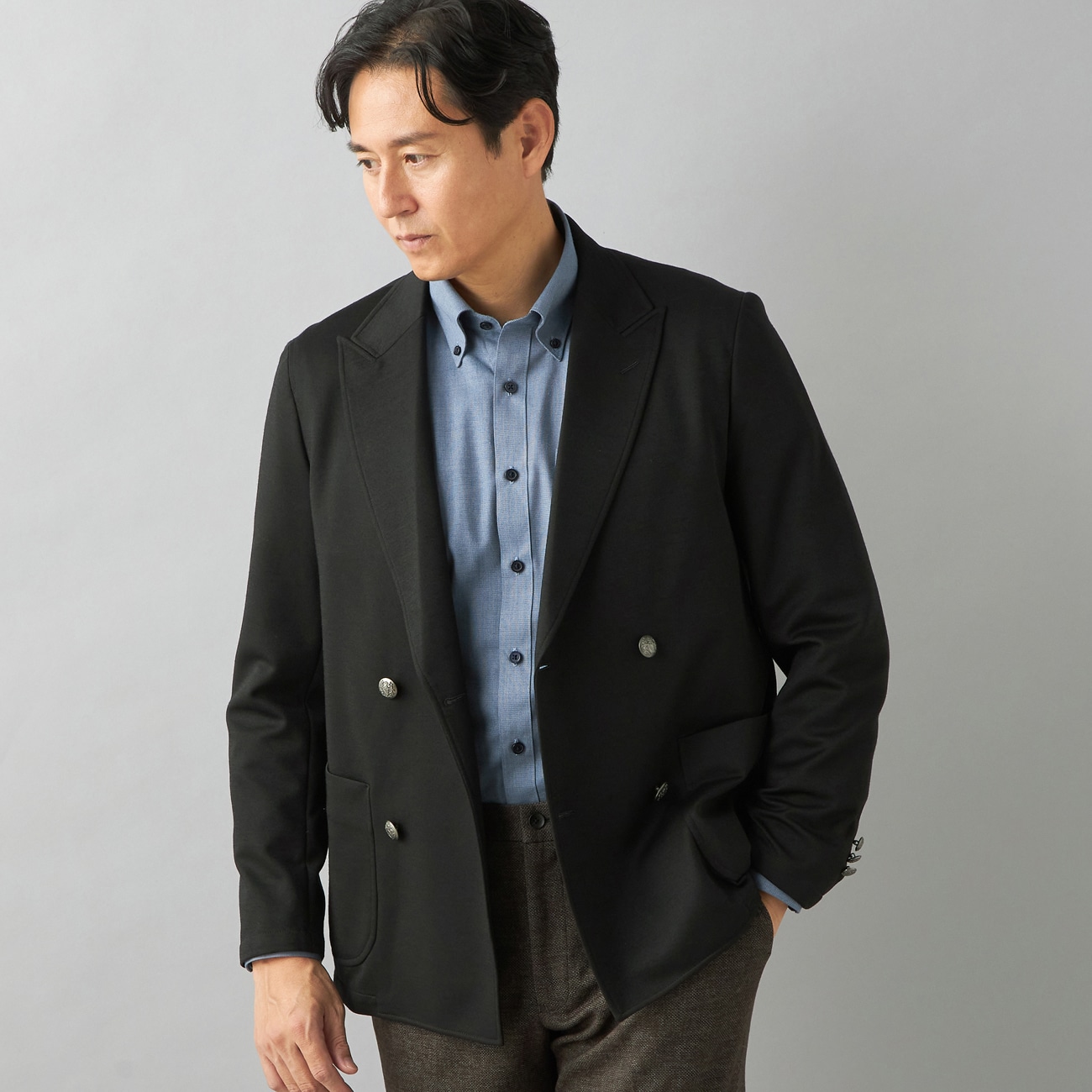 【パジャマブレザー】プレミアム 日本製素材 モクロディメタルボタンダブルブレザー 黒