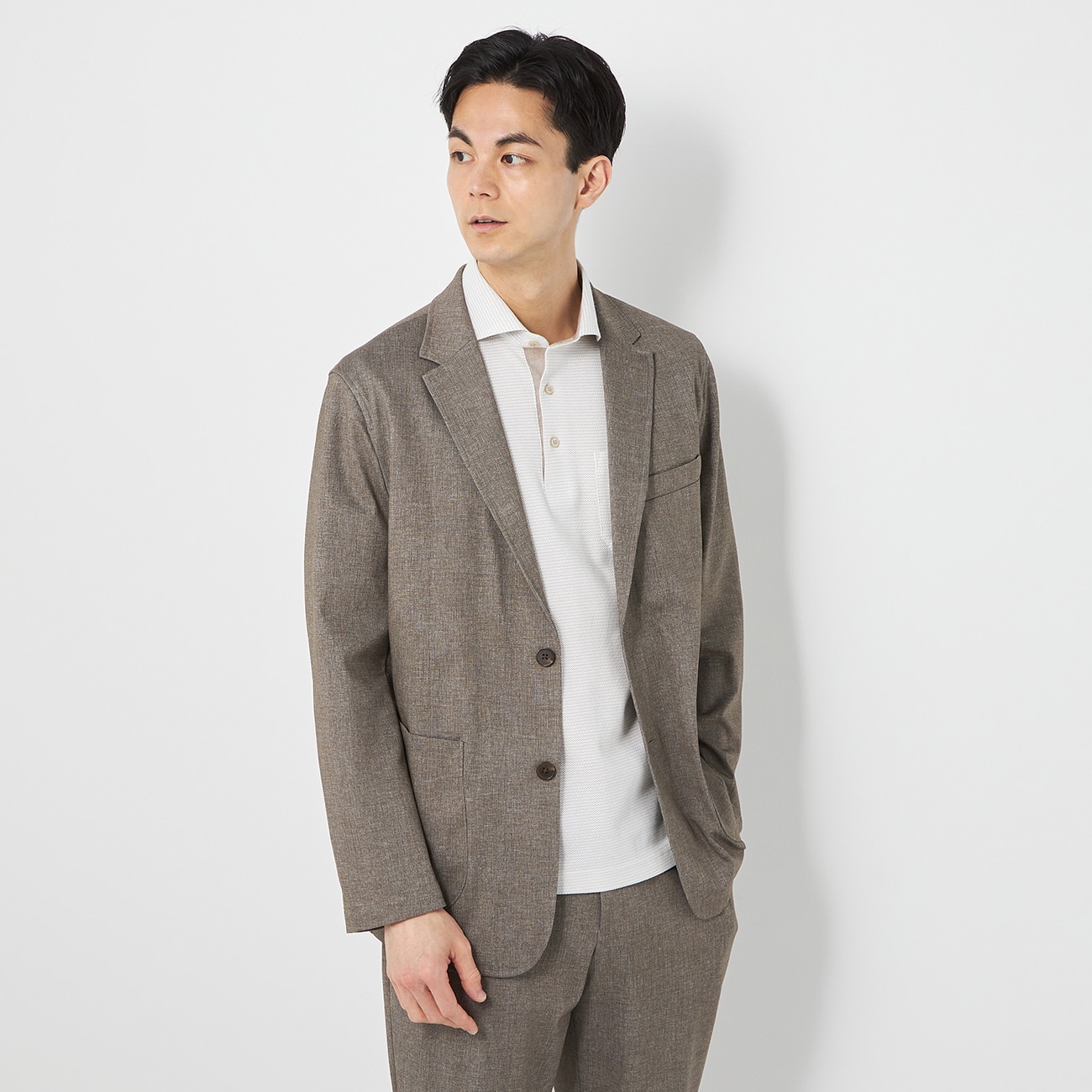 素材感をプリントで表現した、軽量ストレッチ生地のパジャマスーツ「見ためスーツ、着心地パジャマ」をコンセプトに、パジャマの快適さとスーツのフォーマルさを兼ね備えた着ていてもリラックスできるセットアップアイテム。〇表情感ある見た目ながら、軽い着心地ハケメ柄の素材感のある見た目ながら、柄はプリントであしらっているためとても軽い着心地。軽量ジャージ素材でストレッチ性もバツグン。襟付きジャケットで「きちんと感」が高まり、カジュアルからビジネスシーンまでお召しいただきやすいデザイン。中でも外でもさっと羽織れて便利、幅広いシーンで活躍するパジャマスーツの新作です。〇機能性もアップ袖口のボタンを無くしたことで、PC業務も快適にできる仕様にしました。--------------------▼柄ハケメ(刷毛目):刷毛で掃いたような涼し気で爽やか風合い▼仕様テーラード・2つボタン・裏地なし・ポケットあり▼機能〇 洗える(洗濯機洗浄可)〇 ストレッチ性の高いジャージー素材で着心地がいい〇 消臭付属で気になる汗の臭いも低減▼セットアップ 別売りパンツ:品番3SPJ12SL--------------------※サイズ展開について「B」と付いているサイズは、ゆったりめのサイズとなります。着丈・袖丈はそのままに、肩幅・胸囲・ウエストが大きくなっています。詳しくは「サイズスペック」をご確認ください。※本商品にはテーラーバック・キャリーハンガーの付属はございません。---------------------▼スタッフ着用コメント@身長167cm 普段のサイズ:S/本商品着用サイズ:Sスタッフコーデはこちら「ビジネスカジュアルなコーディネートです。ハケメ柄デザインのジャケットは絶妙なブラウンベースの色味がかなり良いです。これからお仕事でジャケパンスタイルをされる方には是非おすすめです。」A身長177cm 普段のサイズ:M/本商品着用サイズ:Mスタッフコーデはこちら「プリントのハケメ柄の仕様している為、無地とは違いお洒落な雰囲気があります。軽量のジャージ素材なので軽い着心地です。サイズ感:標準。素材感:非常に柔らかく、肌触りが良い。着心地:ノーパット仕様の為、常に軽い着心地。」B身長180cm 普段のサイズ:M/本商品着用サイズ:Mスタッフコーデはこちら【着用感】・ ジャケットのサイズはMサイズです!・肩幅・袖丈・着丈は丁度良いです◎・胸周り・胴回りは少しゆとりがあります◎・ストレッチもしっかり効いてます◎・身体のラインが出にくいので太めのパンツにも合わせやすいです♪【素材感】・肌触りはツルッと滑らかで柔らかいです◎・ハリ、コシがあるので摩擦とシワに強そうです◎・背抜きでやや薄い生地です・色合いは紺です。・ハケメ柄で珍しく以外とパンツもインナーも合わせやすいです◎---------------------