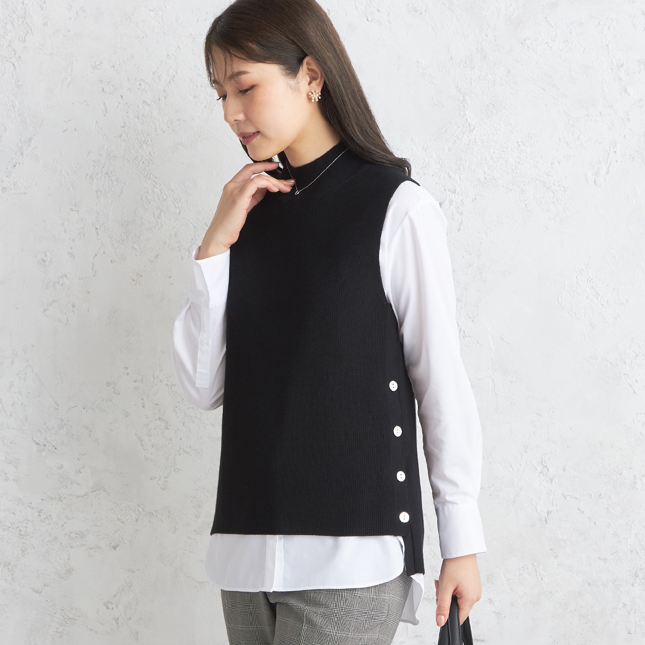 ちょっぴり肌寒さを感じる季節から大活躍のニットベスト◆企画者コメント◆昨年よりも糸番手を太くすることで、より網目がクリアになるようにしました。襟元はすっきりと、脇にゴールドボタンを配置することで視覚的に縦長効果を期待できます!〇左脇のメタルボタンがアクセント・秋からぴったりな重ね着アイテム・薄すぎず、厚すぎない程よい肉感のニットベスト・ハイネックで上品に、でも程よいラフさも取り入れたデザイン〇洗えて静電気も抑制洗濯機で洗える仕様。静電気低減テープが付いており、冬の乾燥にも配慮。--------------------▼仕様 ※当社比透け感…なし裏地…なし伸縮性…あり光沢感…なし生地の厚さ…やや厚め生地感...柔らかタッチの程よい厚さボタン...ゴールドのメタルボタン▼機能〇 洗える(洗濯機洗浄可)〇 静電気低減--------------------▼スタッフ着用コメント@身長154cm 普段のサイズ:S/本商品着用サイズ:Mスタッフコーデはこちら・丈が長くヒップが隠れる程の長さです。・柔らかい生地感でチクチクしませんでした。・肌寒くなって来たので1枚あると安心◯A身長159cm 普段のサイズ:M/本商品着用サイズ:Mスタッフコーデはこちら・レイヤードがしやすいように前の丈感が少し短めに後ろの丈感はやや長めになっていてお尻をカバー◎・肌触りは柔らかく着やすい、チクチク感なし。・ヨレヨレになりにくそうなしっかりした生地。B身長162cm 普段のサイズ:M/本商品着用サイズ:Mスタッフコーデはこちら・首はハイネックですが、高すぎないデザインのため、首元締め付け感なし・着丈はヒップの真ん中くらい・伸縮性かなりあり、伸びる柔らかい素材です・胴回りゆったりめです--------------------