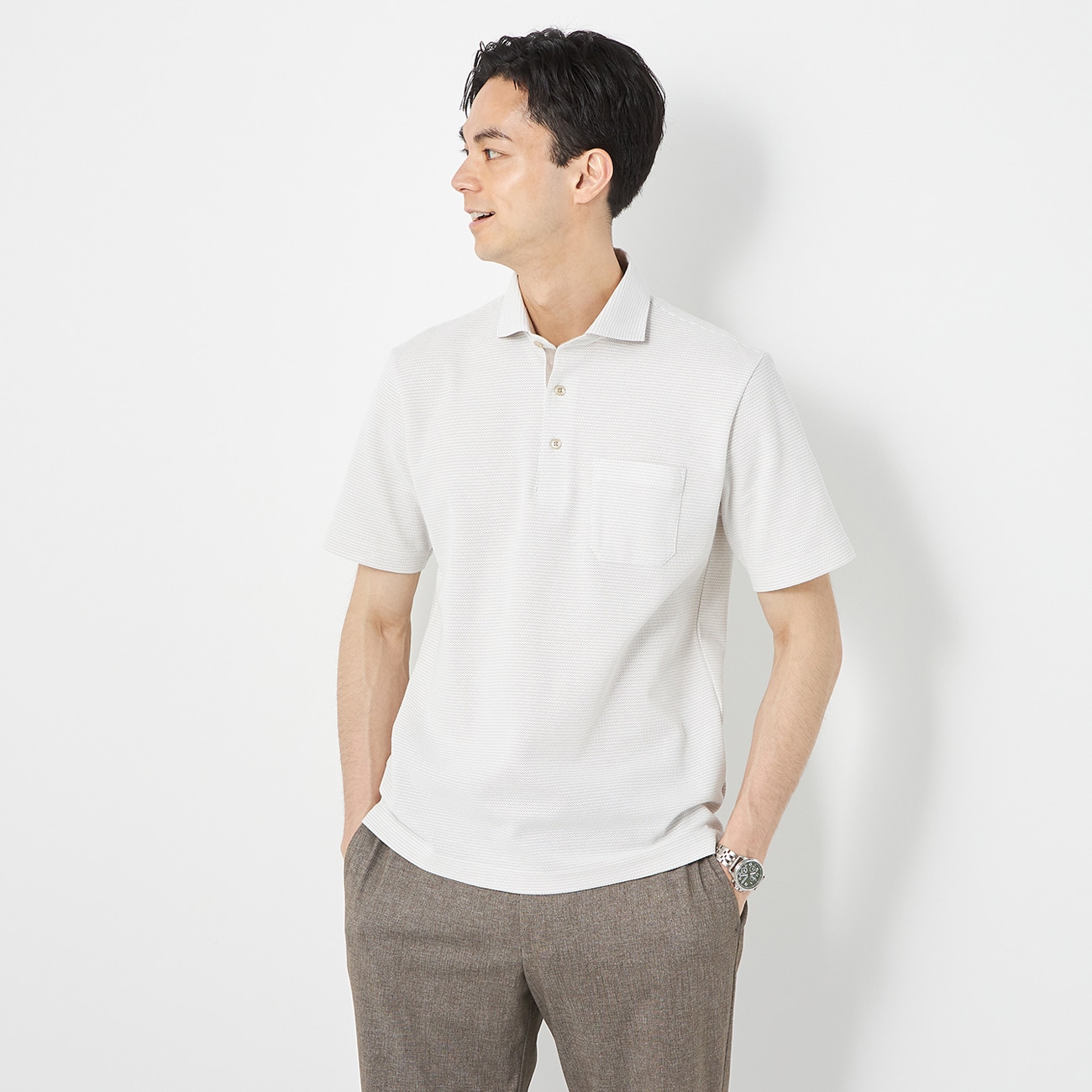 気やすさを追求した日本製ポロシャツ「肌触りが良くて快適」「着心地抜群!」「汗をかいてもサラサラ」と昨シーズン大好評だった日本製ポロシャツが今年も登場。〇こだわりの日本製品質やデザインにこだわり、丁寧に作られたメイドインジャパン製品。細部まで行き届いたこだわりの仕様とデザイン。着やすさを追求した縫製やパターン設計、オリジナルの開発素材など世代を超えて愛されるコレクションです。〇清涼感のあるデザインと生地襟が程よく開いたワイドカラーデザイン。きちんと感がありながらも、清涼感のある色柄でオンオフ問わず幅広いシーンに活躍。--------------------▼機能〇 洗える〇 日本製素材〇 汗の不快感を低減する吸汗速乾〇 速乾なので、部屋干しでもすぐ乾く〇 気になる臭いを軽減する消臭糸使用--------------------▼スタッフ着用コメント@身長168cm 普段のサイズ:M/本商品着用サイズ:Mスタッフコーデはこちら「サイズ感は胴回りにややゆとりありです。選ぶサイズ感は普段のサイズ感でいいと思います。サラッとした着心地で夏でも着心地抜群です!」A身長175cm 普段のサイズ:S〜M/本商品着用サイズ:Mスタッフコーデはこちら「・ポロシャツ着用感 ・サイズ選びはいつものお洋服のサイズ選びがおすすめです! ・胸周りはややすっきりしていますので、だらしなくなり難いシルエットです。 ・裾がスクエア状にカットされていますので、シャツイン・シャツアウト両方のスタイリングで着る事が出来ますよ♪ ・生地はストレッチがしっかりと効きます!胸周り・肩回りは特に楽な着心地です! ・ワイドカラー仕様の商品ですので、スッキリとした見た目でご利用頂けます! ・気になるにおいを抑えてくれる、消臭糸使用です。」B身長180cm 普段のサイズ:L/本商品着用サイズ:Lスタッフコーデはこちら「サイズ感はややスッキリしたシルエットです!Lサイズ着用ですがぴったり目が好みならMサイズです!着心地はストレッチ素材で動きやすく軽いです!汗をかいても乾きやすくサラッとしています!」--------------------