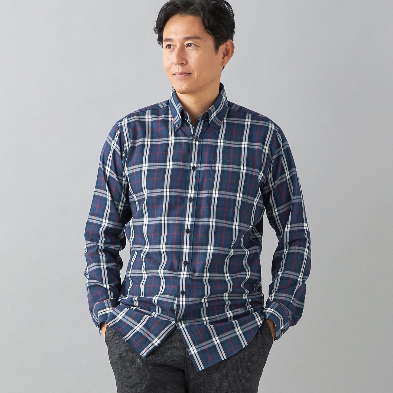 肌寒くなるこれからの季節に1枚は持っておきたいピーチ起毛のカジュアルシャツちょうどいい生地厚、さっと羽織れる起毛感のある素材で肌寒さもカバー。大人っぽい落ち着いた配色、程よいシルエット。トレンド感もあり、レイヤードスタイルなど今っぽい着こなしも楽しめます。〇表地は上品な印象のピーチ起毛桃の産毛状のような手触りの感触の加工方法で他とは一味違った表情を楽しめる素材感です。〇ソフトタッチな肌触り手に取った時に実感する微起毛で暖かみのある素材感と気持ちの良いソフトで滑らかな肌触り。イージーケアでお手入れも楽。〇ボタンダウンデザイン襟先をボタンで留めたボタンダウンシャツは、ノーネクタイで着用しても襟立ちがよく、立体的なシルエットになるためシャツのみで着用しても様になります。--------------------▼コーディネートハイネックセーター等とのレイヤードスタイルもおすすめです。▼機能〇 立体パターン〇 イージーケア(シワになった際に簡単なアイロン掛けできれいになる)〇 ソフトタッチ--------------------▼スタッフ着用コメント@身長169cm 普段のサイズ:S/本商品着用サイズ:Mスタッフコーデはこちら・普段のシャツのサイズ感で大丈夫。・肩幅/袖丈は丁度良く、胴回りは無理のないサイズ感で着用。・柔らかくやや起毛だった暖かみのある生地感。・ソフトな優しい着心地。・大きめの柄でも濃い目の色で落ち着いて使える。A身長173cm 普段のサイズ:L/本商品着用サイズ:Lスタッフコーデはこちら・着こなししやすい生地の厚さで、起毛素材で肌寒さくなるこれからの季節にお勧めシャツです。・大人っぽい落ち着いた配色、程よいシルエット。・柔らかいソフトタッチな肌触りで気持ち良いです。・もちろんおうちで洗えて、肌触りも良く超着やすいですよ〜♪B身長179cm 普段のサイズ:M~L/本商品着用サイズ:Lスタッフコーデはこちらサイズ感:ワイサイズ上でオーバーめに着ています。着用感: 程よく起毛していて暖かみがあり、肌触りがとても良いです。特徴: ソフトタッチのイージーケアです。--------------------