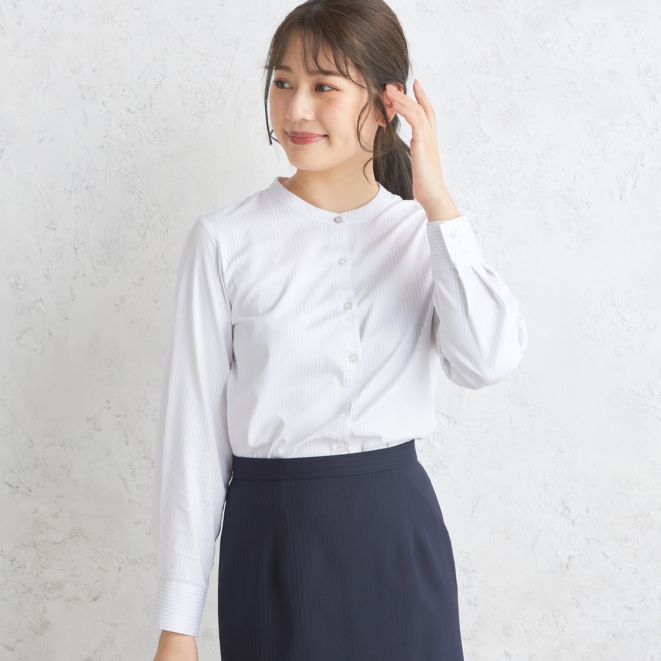 透けない生地感、ジャケットを羽織ってももたつかない絶妙なシルエット〇すっきりした印象のバンドカラーシャツバンドカラーで首回りをすっきりしつつも、アクセントのある第一ボタンを使用することで寂しくなりすぎない印象に。〇オンオフ兼用できるサイズ感に程よくゆとりを持たせたシルエットにしながらも、上からジャケットを羽織ってももたつかないサイズ感に。丈感も、ボトムアウトしても程よい長さに仕上げました。ニットとレイヤードして着るのもおすすめ。〇嬉しい機能がたくさん透けにくい生地を使用しているため安心です。ソフトタッチ生地でやわらかな肌触り。UVカット機能も付いているため日焼け対策もばっちり。--------------------▼仕様 ※当社比透け感…なし裏地…なし伸縮性…ややあり光沢感…なし生地の厚さ…普通▼機能〇 洗える(洗濯機洗浄可)〇 形態安定加工でお手入れも簡単〇 透けにくい素材で安心〇 柔らかソフトタッチ生地で着心地快適〇 UVカットで紫外線対策も安心 --------------------※購入時のたたみジワが気になる場合は軽くアイロンをおかけください。※洗濯はシャツのサイズに合った洗濯ネットに1枚ずつ軽くたたんで入れ、脱水時間を短めに設定し、脱水後はすぐに干していただくときれいにシワが伸びます。--------------------▼スタッフ着用コメント@身長156cm 普段のサイズ:M/本商品着用サイズ:Mスタッフコーデはこちら・絞りを抑えたストンとしたシルエットただタボっとした感じでは無いので、基本は私服と同じサイズ選びがお勧め普段MとL両方の方はMがお勧めです・表地はコットンの様な風合い裏側がツルッとした素材なので透け感がだいぶ抑えられています肌あたりもなめらかで気持ちいいです・第一ボタンだけさりげないデザインボタンで控えめながらアクセントになります。A身長162cm 普段のサイズ:S/本商品着用サイズ:Sスタッフコーデはこちら【サイズ感】・普段のサイズ選びです。・バストやウエストも程よくゆとりがあります。・体型をひろわないシルエットです。【素材感】・ポリエステルと綿の混紡素材でやわらかいです。・ちくちく感なく、肌触りも良いです◎・首元がつまっていて落ち着きます。・ベージュのインナー合わせがおすすめです。B身長162cm 普段のサイズ:M/本商品着用サイズ:Mスタッフコーデはこちら生地→やや薄手、透け感なし肩→いつものサイズ感胸回り→いつもよりややピッタリめ腕周り→普通胴回り→いつものサイズ感袖丈→長袖首元→上まで全部ボタン止めれるバンドカラー