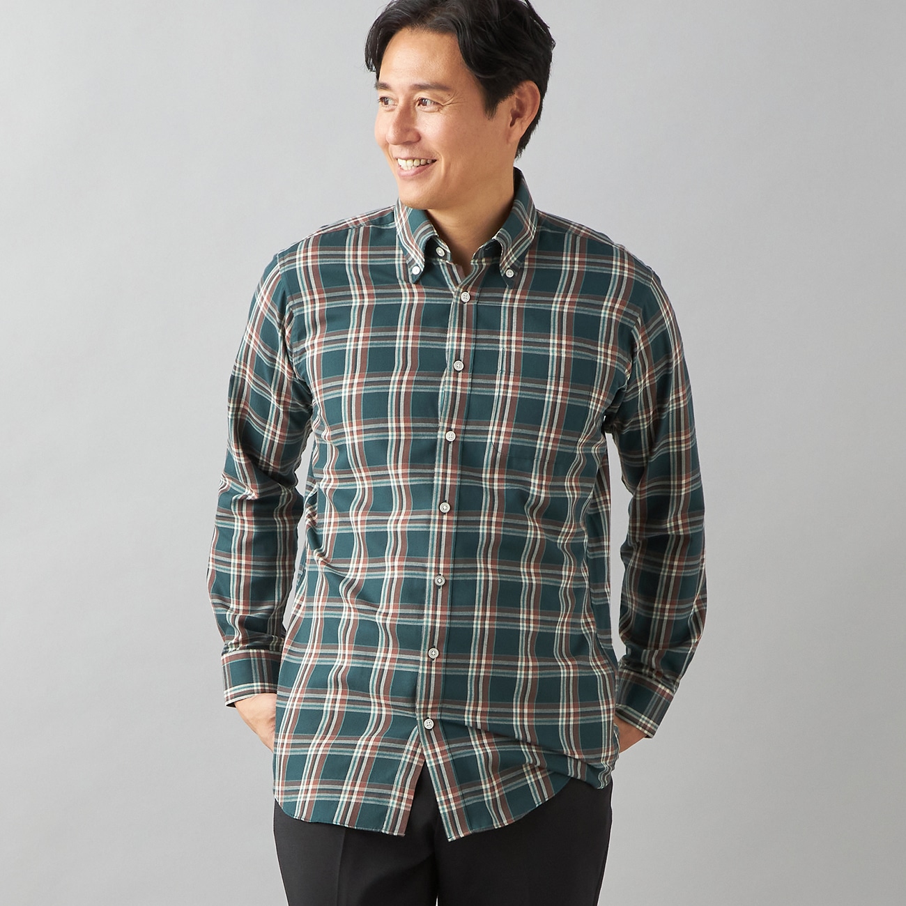 肌寒くなるこれからの季節に1枚は持っておきたいピーチ起毛のカジュアルシャツちょうどいい生地厚、さっと羽織れる起毛感のある素材で肌寒さもカバー。大人っぽい落ち着いた配色、程よいシルエット。トレンド感もあり、レイヤードスタイルなど今っぽい着こなしも楽しめます。〇上品な印象のピーチ起毛桃の産毛状のような手触りの感触の加工方法で他とは一味違った表情を楽しめる素材感です。〇ソフトタッチな肌触り手に取った時に実感する微起毛で暖かみのある素材感と気持ちの良いソフトで滑らかな肌触り。イージーケアでお手入れも楽。〇ボタンダウンデザイン襟先をボタンで留めたボタンダウンシャツは、ノーネクタイで着用しても襟立ちがよく、立体的なシルエットになるためシャツのみで着用しても様になります。--------------------▼カラー・柄品の良いあたたかみのあるグリーンのビッグチェック柄。ロングTシャツやセーター等とのレイヤードスタイルもおすすめです。▼機能〇 立体パターン〇 イージーケア(シワになった際に簡単なアイロン掛けできれいになる)〇 ソフトタッチ