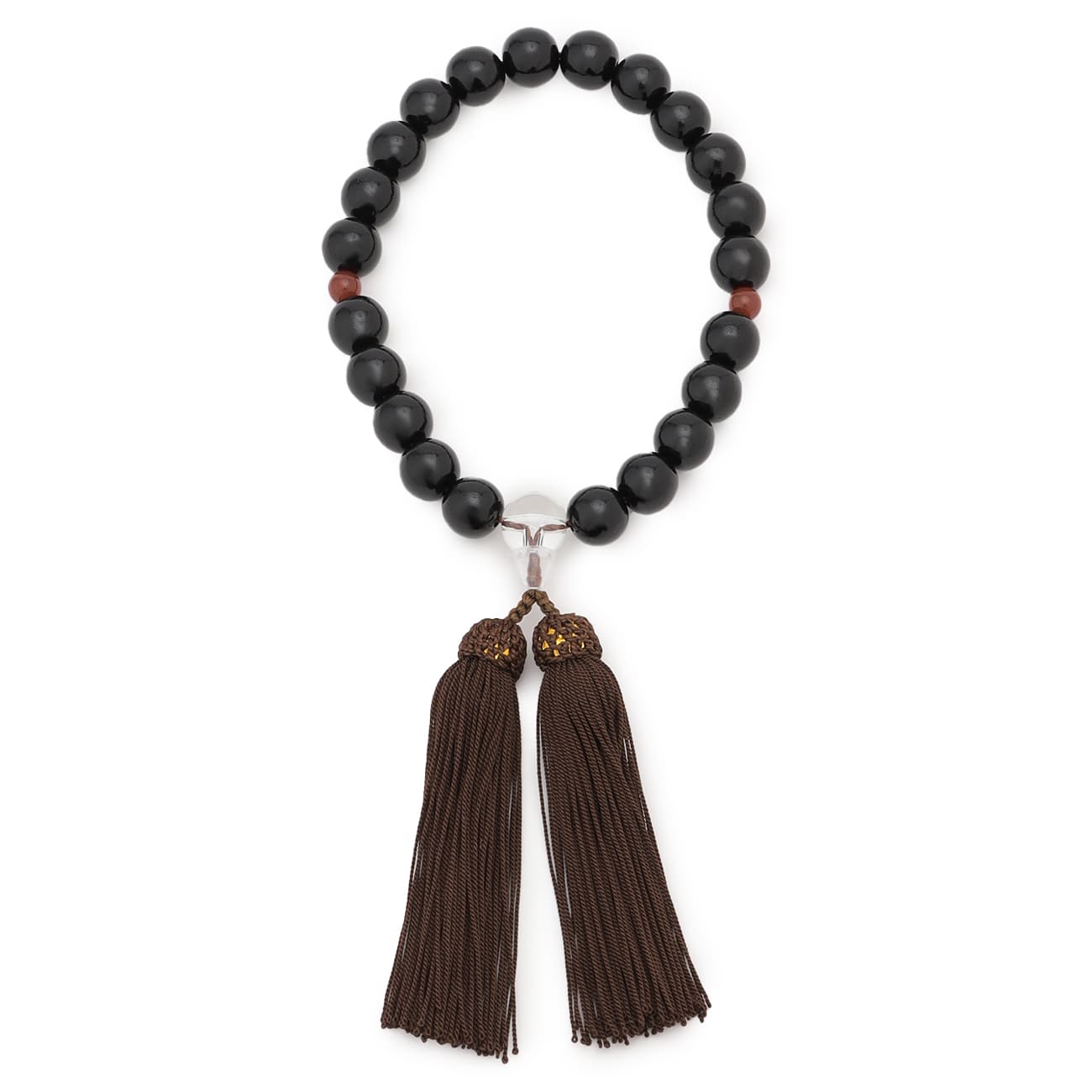 宗派を問わずお使いいただける略式の男性用念珠です。黒檀22玉、天珠は瑪瑙(めのう)を使っています。房はこげ茶色の房で仕立てています。