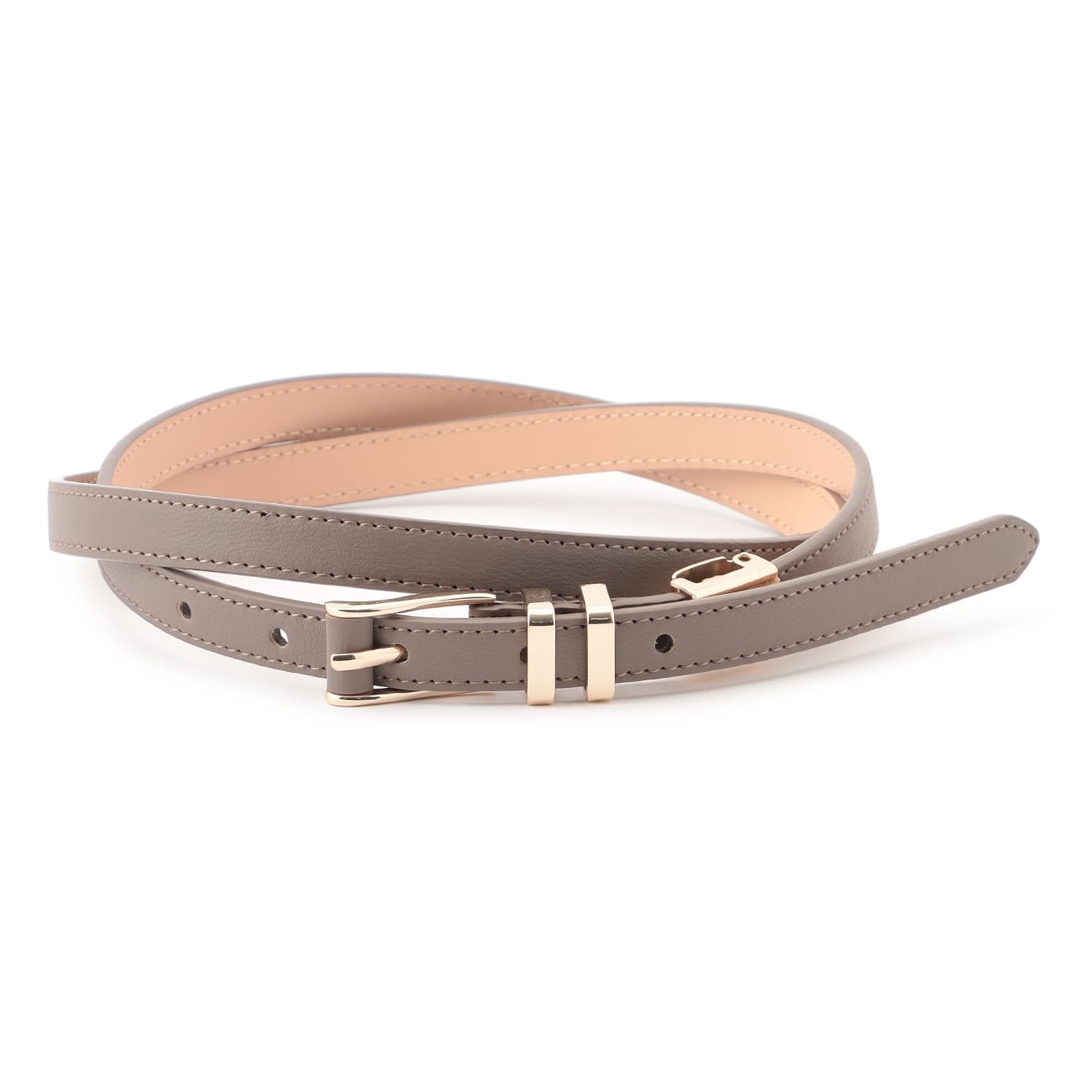 ダブルループがコーディネートのアクセントに〇シンプルきれいめ、いつものコーデをワンランクアップ・通年使いやすい素材感・ビジネスシーンに合う1.5cm幅のピンベルト・コーディネートを程よく引き締めるダブルループの金具デザインバックル・その他金具の色味:薄いゴールド