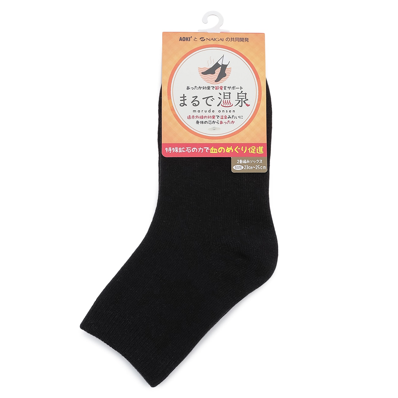 冬の寒さと節電対策に!遠赤外線の力を活かした「まるで温泉」2重編みソックス◆企画者コメント◆AOKIとNAIGAIで共同開発した、あったか効果で節電をサポート「まるで温泉」シリーズ新登場です!遠赤効果でまるで温泉や足湯につかっているような温かさが持続する2重編みソックスです。〇遠赤外線が血行を促進プリントされた「テラヘルツ鉱石」が放つ遠赤外線は、血行の促進が期待できます。※本品自体に発熱する機能はありません。〇温かさの秘密「足先」を、2重編みの保温力と血の巡りを促進する特殊な鉱石プリント(足裏に使用)のチカラでまるで温泉につかっているような温かさが持続します。〇冬のあったか節電アイテム快適に過ごしながらも光熱費をカットできる。電気を使わないから場所を選ばず寒さ対策ができるのも魅力。寒さを感じたらさっと履くだけ!あったか冬のイチオシアイテムです。--------------------▼機能〇 洗える(洗濯機洗浄可)〇 保温
