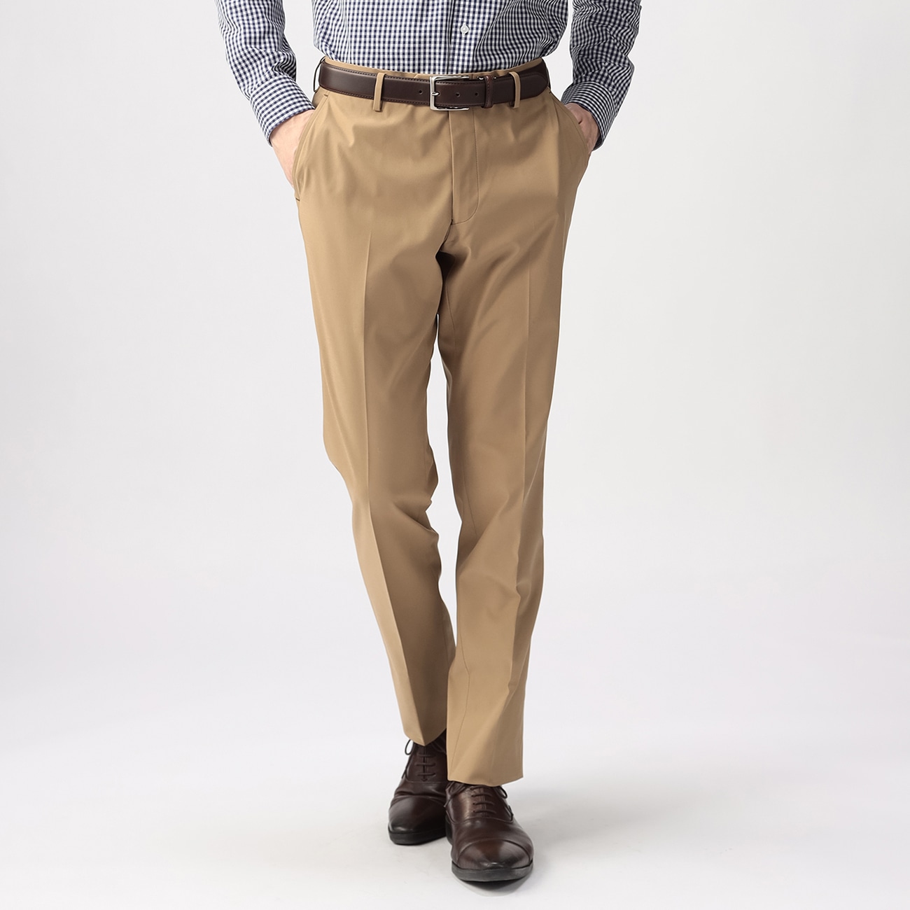 お手入れ簡単・スーパーストレッチの超快適パンツ〇伸縮性抜群のスーパーストレッチ素材を使用身体の動きに合わせ、伸び縮みするバツグンのストレッチ性でストレスフリーの履き心地。生地ストレッチに加えて、ウエスト部分も伸びる仕様の「体感ストレッチ仕様」で窮屈感を緩和し快適仕様。仕事で動き回らなければならないときも、座り姿勢が多くても、お食事のあとでも、ちょっとした運動にも着心地らくらく。〇お手入れ簡単・いつでもキレイをキープご自宅で洗って干してすぐ着られる「ノンアイロン」でお手入れ簡単。フットワークを軽くしてくれる、ストレスフリーなパンツです。--------------------▼仕様テーパードノータック(細め)サイズ感:スリム(当社比で細めのサイズ)股上浅めのローライズパンツのため、ウエストサイズは+2cmで仕上がっています。※ウエストサイズ73cmの場合、実際は75cmの仕上がりサイズとなっています。詳しくはサイズスペックをご確認ください。▼機能〇 洗える(洗濯機洗浄可)〇 はっ水 ※防水ではございませn〇 ノンアイロン〇 スーパーストレッチ--------------------※当製品は素材の特性上、裾の仕上げはジーパン仕上げ・ダブル仕上げとさせていただきます。またウエスト直しはお受けできませんので、ご了承ください。※こちらは裾のお直しが必要な商品です。補正をご希望の場合は「お直しの選択」ボタンよりお選びください。
