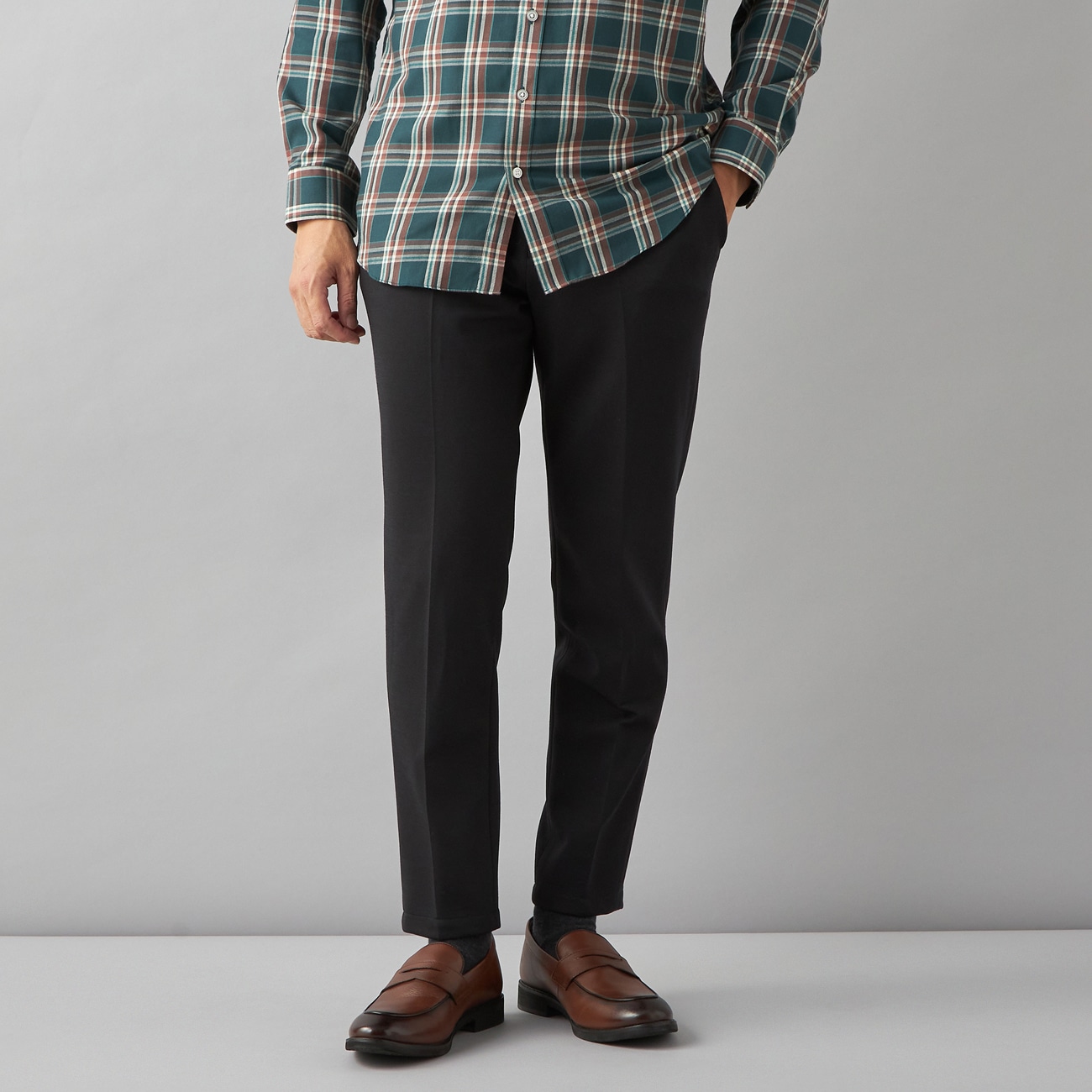 AOKIのロングセラー商品・洗えるウールブレンドゆったりシルエットのワンタックパンツ◆企画者コメント◆きちんと感がありながらも軽い着心地のビズスラックスです。秋冬らしい起毛感や柔らかさを出すために通常使用するウールより細いウールを使用しています。ウエストもストレッチ仕様にし、快適な履き心地にこだわりました。毎シーズン大好評の「洗える」セットアップシリーズのノンアイロンウールブレンドストレッチパンツ。秋冬らしい起毛感のある生地を使用し、快適な履き心地ながらもきっちり感があり、セットアップからビジカジスタイルまで、普段使いしやすく着回し抜群です。〇表情豊かな混紡表地表地は凹凸のある表情豊かなウールとポリエステルの混紡生地、ポリエステルを入れることで防しわ性と耐久性もアップ。秋冬らしい起毛感や柔らかさを出すために通常使用するウールより細いウールを使用。保温性を保ちながら、お手入れしやすく、型崩れしにくいのも◎〇ストレスフリーな着心地生地のストレッチ性に加え、ウエストらくらく仕様(ウエスト両脇が一部ゴム仕様になっており、左右約2.5cmずつ、計約5cm伸びます)で快適な履き心地です。〇ノンアイロンでお手入れも簡単いつでも家庭洗濯機で手軽に洗えてクリーニング代も節約。ノンアイロンでお手入れ簡単。--------------------▼本商品と共生地のセットアップ 別売りジャケット:品番8235602ノータックパンツ:品番S232K972--------------------カラー・柄シンプルですっきりとしたネイビーのウィンドウペン柄。汎用性が高く若々しく柔らかな印象に▼仕様ワンタックサイズ感:ベーシック(当社比でゆったりめのサイズ)▼機能〇 洗える(洗濯機洗浄可)〇 ノンアイロン〇 ストレッチ〇 ウエストらくらく(ウエストムーブ) ※ウエスト両脇が一部ゴム仕様になっており、左右約2.5cmずつ、計約5cm伸びる仕様--------------------※こちらは裾のお直しが必要な商品です。ミシンでの補正をご希望の場合は「お直しの選択」ボタンよりお選びください。またお急ぎの場合はアイロンで裾上げができる、裾上げテープもご用意しております。
