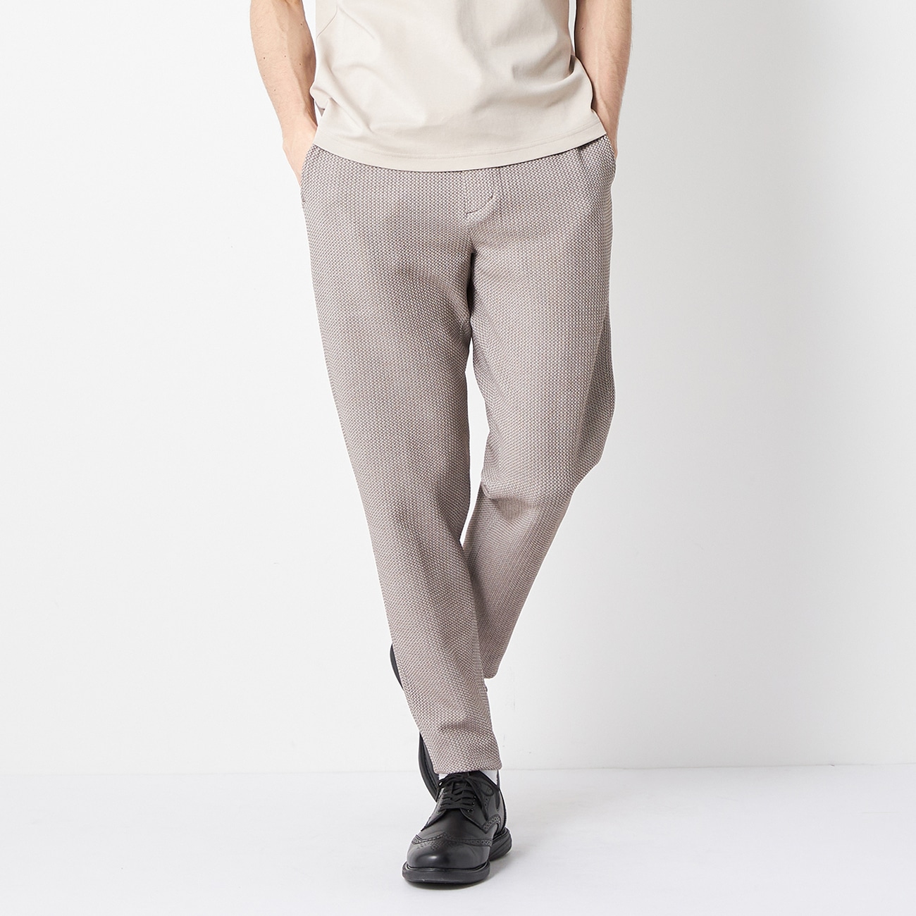 ストレッチ性抜群・ストレスフリーな着心地が魅力のパジャマスーツ「見ためスーツ、着心地パジャマ」をコンセプトに、パジャマの快適さとスーツのフォーマルさを兼ね備えた着ていてもリラックスできるセットアップアイテム。〇ストレッチ性抜群の二重臼編みニット生地ポリエステル100%の二重臼編みのニット生地を使用。パジャマスーツシリーズの中でも格段のストレッチ性でストレスフリーな着心地。二重臼編みは二本の糸を立体的に編みこむため、凹凸感があり接地面積が少なく、夏も快適にご着用いただけます。ノータックですっきりきれいめシルエット。前開きのファスナーでベルトループも付いているためスラックス見えし、さまざまなシーンで活躍できるパンツです。〇パジャマスーツで人気の明るめカラー2色の糸を編み込むため、裏面の色との絶妙なコントラストが着こなしのアクセントに。ふんわりとした発色感が優しい印象を与える一着です。--------------------▼仕様ノータック・裾上げ済・ウエストゴム・裏地なし・ポケットあり・ドローコード(ヒモ)付き▼機能〇 洗える(自宅で洗えるウォッシャブル仕様でいつでも清潔)〇 ストレッチ性抜群のニット素材で着心地がいい〇 消臭付属で気になる汗の臭いも低減--------------------▼セットアップ 別売りジャケット:品番3SPJ1JK2B--------------------※本商品にはテーラーバック・キャリーハンガーの付属はございません。※本商品は素材の特性上、お裾直しは不可となりますのでご了承ください。(裾上げ済のため、お裾補正なしでお召しいただけます。 股下丈については「サイズスペック」をご確認ください)--▼スタッフ着用コメント@身長170cm 普段のサイズ:73p、M/本商品着用サイズ:Sスタッフコーデはこちら「テーパードですが渡り部分にゆとりがあり楽ちんです。単品でもセットアップでも着回し抜群のパジャマスーツを是非お試しくださいませ。」A身長174cm 普段のサイズ:79p/本商品着用サイズ:Mスタッフコーデはこちら「まさしく"履くセーター"といった履き心地の良さです。家を出て帰って来るまで、一日中履いているパンツですが…ホントに快適なので、家に帰ってきてからも、着替える事なくそのまま履いていたくなる抜群の履き心地の良さです。下にタイツを履いて撮影しました。春夏物ですがタイツを履いていれば少し気温高めの日なら2月下旬、3月上旬の頃から着用いただける感じです。」B身長180cm 普段のサイズ:79p/本商品着用サイズ:Mスタッフコーデはこちら「テーパードで細身のシルエットです!Lサイズで少しゆったり目に着るのも◎ウエストは紐で調整することができベルトもできます!」---------------------