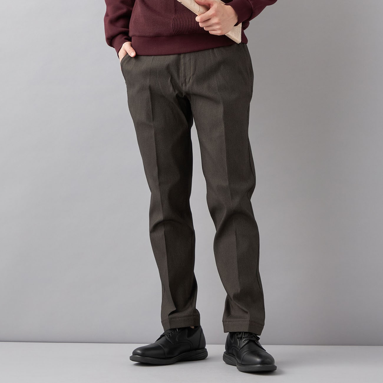 裾の長さを自由に調整できる画期的なアイテム「らくQパンツ」冬素材が新登場!〇裾合わせが自由自在!裾に芯を貼っているため、裾を折って裾の長さを自由に調整できます。内側に折ればキレイめスラックスに。外側に折ればカジュアルライクに。「らく」に「Quick」に使える「らくQパンツ」をぜひお試しください!※芯の幅は約3.5cmとなっているため、一折りすると約3.5cm、二折りすると約7cm短くなります。こちらは生地の厚み上、最大2回のレングス調整が可能です。〇裏起毛素材で暖かく、楽なのにきちんと見えする秋冬に嬉しい裏起毛素材のため、暖かい着用感でお召しいただけます。さらに身生地とウエストのダブルストレッチで履き心地もらく!楽に着られるのにきちんと見えてだらしなくならない、一本二役、2通りのスタイリングが楽しめるカジュアルパンツです。--------------------▼仕様テーパードノータック(細め)▼カラー黒はグレー見えします。▼機能〇 洗える(洗濯機洗浄可)〇 身生地ストレッチ〇 ウエストストレッチ--------------------【補正について】本商品は裾に芯が入っており、一度取り外すと同じように取り付けることができないためお裾直しは不可となります。裾を折ることで長さを調整できますのでご了承ください。【お取り扱い上のご注意】この製品は染料の性質上、着用時に汗や摩擦により他の衣料に色が移ることがありますので、ご注意ください。また、洗濯の際には白・淡色品と分けて洗ってください。--------------------▼スタッフ着用コメント@身長169cm 普段のサイズ:S/本商品着用サイズ:Mスタッフコーデはこちら「・標準的なサイズ感で着用。ウエスト〜太ももはやや余裕があり、裾幅は細めでスッキリ。 ・暖かみのある裏起毛の生地感。 ・抜群の伸びで動きやすい履き心地。 ・ビジカジ〜カジュアルまで使えるキレイめな一本。※裾は内側に一折りしています。」A身長175cm 普段のサイズ:M〜L/本商品着用サイズ:Mスタッフコーデはこちら「・普段通りのMサイズでピッタリでした。 ・ベージュを着用、ノータックのスッキリシルエット。 ・裾上げ済みなのですぐに着用可。 ・裾を折り返して長さを変えれるスグレモノ。今回は1回外に折り返しして着用してます。 ・ストレッチが入っておりグイッと動きやすい素材です。 ・裏起毛仕様で暖かく過ごしていただけます!」B身長179cm 普段のサイズ:S/本商品着用サイズ:Sスタッフコーデはこちら「サイズ感:テーパードなので細めです。 着用感: ストレッチがとても効いていて履きやすいです。 特徴:丈上げ済みでシングルや折り返してダブルにできます。」 --------------------