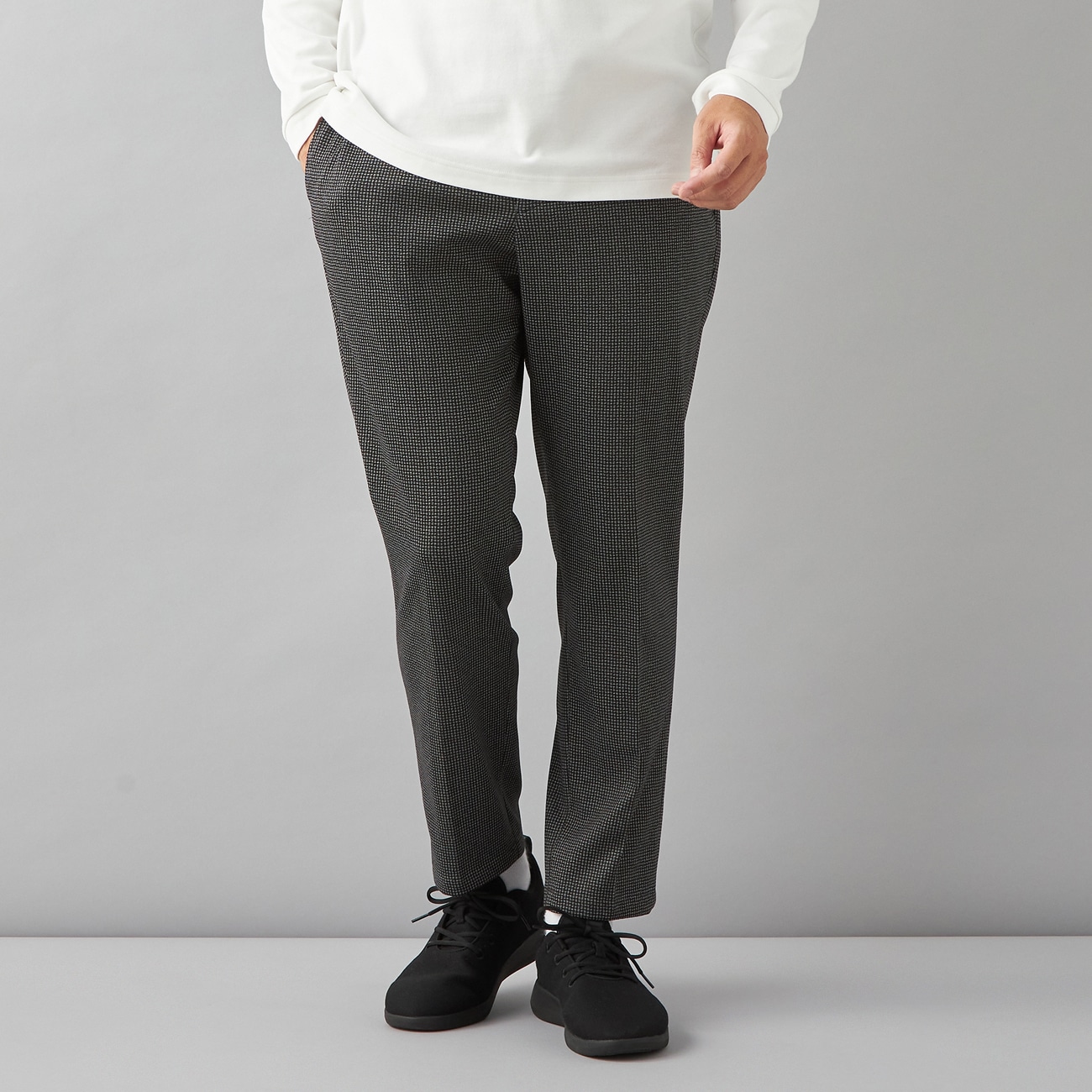 軽量ストレッチなプリント生地のパジャマスーツ程よいアクセントをプラスする千鳥格子柄「見ためスーツ、着心地パジャマ」をコンセプトに、パジャマの快適さとスーツのフォーマルさを兼ね備えた着ていてもリラックスできるセットアップアイテム。日経電子版広告特集に掲載されました!「部長も着たい いまどきスーツ パジャマスーツ チャレンジ」2023年10月13日〜11月12日掲載日経電子版広告特集を見る(外部サイト)〇表情感ある見た目ながら、軽い履き心地素材感のある見た目ながら、柄はプリントであしらっているためとても軽い着心地。ジャージ素材でストレッチ性もバツグン。ノータックですっきりきれいめシルエット。前開きのファスナーでベルトループも付いているためスラックス見えし、さまざまなシーンで活躍します。--------------------▼柄グレーの千鳥格子柄▼仕様ワンタック・裾上げ済・ウエストサイドゴム裏地なし・腰ポケット・ヒップポケットドローコード(ヒモ)付き※ヒモは内側に抜くこともできるため、ベルトを通すときも邪魔になりません。▼機能〇 洗える〇 ストレッチ〇 ウエストらくらく〇 静電気低減テープ使用--------------------▼セットアップ 別売りジャケット:品番3WPJ2JK02--------------------※裾上げ済のため、お裾補正なしでお召しいただけます。 股下丈については「サイズスペック」をご確認くださいませ。※本商品にはテーラーバック・キャリーハンガーの付属はございません。--------------------▼スタッフ着用コメント@身長167cm 普段のサイズ:76/本商品着用サイズ:Sスタッフコーデはこちら・ウエストは伸び縮みする素材により窮屈感なくジャストフィットでご着用頂けます。・渡り巾にはゆとりがありながら、裾巾はテーパード仕様のため着易くシルエットも綺麗なデザインです。A身長175cm 普段のサイズ:82/本商品着用サイズ:Mスタッフコーデはこちら・抜群のストレッチ性・柔らかい着心地・秋口から着られる3シーズン生地・ご自宅でお洗濯可・ドローコードとベルトループ付きなのでビジカジ着回せるB身長180cm 普段のサイズ:76,79/本商品着用サイズ:Lスタッフコーデはこちら・パンツはウエストゴムの為、ヒップ周りがゆとりあります。・丈の長さはLサイズで股下74pで身長ある方はくるぶし上ぐらいになります。・長く感じた方はロールアップして、短く感じた方は腰位置を少しずらすか、同色の靴下でカバーすると良いです◎・肌触りは起毛ぽいジャージみたいな肌触りですがサラッと柔らかい生地感です◎・ハリとコシがあるため、キチンと感がありシワに強そうですが摩擦には弱そうです。--------------------