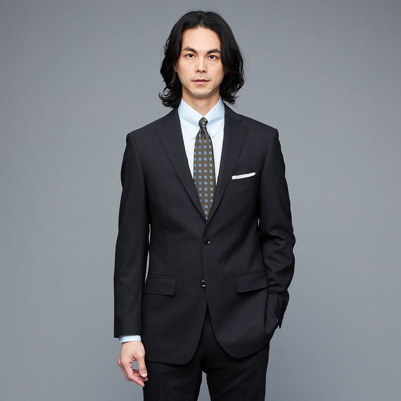 デザイナー島田順子が提案する「大人のための上質なスタイリッシュブランド」JUNKO SHIMADA JS homme ブルーレーベル〇アスレチックウールシリーズ・Super100'sの極細ウールの上質感、JS hommeならではの美しいシルエットで鮮やかな発色性とソフトな風合いが特長です。ストレッチ性が高く、上質な素材ながら快適な着心地です。・襟ののぼりが首に自然と吸い付き、すっと高く上る襟は見た目の美しさだけでなく、首と両肩の3点でバランスよくジャケットの重量を支えるため、着心地も軽くなります。・上着の裏地には、抗菌防臭加工を施した「キュプラ素材」を使用。滑りが良く、吸湿性も高いため快適な着用感です。--------------------ナチュラルショルダー緩やかに流れる曲線が美しいナチュラルショルダー。極薄毛芯パットの採用と、丸く縫う縫製技術で着用感に優れています。本台場仕立て主にオーダースーツに用いられてきた仕様で、ポケットに物を入れても型崩れしにくい表生地を多く使うため、贅沢な仕様。オリジナルボタン仕上げにこだわった日本製のオリジナルボタンを採用。コンフォート仕様パンツのウエストベルトに特殊な仕様とストレッチ芯を使うことで快適な着用感を実現。--------------------▼仕様ジャケット仕様:AMFステッチ・サイドベンツ・背抜き観音仕立て・3つボタン・本台場・マルチポケット付パンツ仕様:ノータック※ジャケットは3つボタンになっておりますが、1番上のボタンは飾りボタンのため、ボタンを留める際は真ん中のボタンだけお留めください。▼生地の厚さ普通▼機能 〇 ストレッチ表地で動きやすい〇 極細ウール ※極細ウールを使用しているため、連続着用はお避けください。着用時についた軽いシワは、ハンガーにかけて2〜3日すると自然に回復します。スーツの休息が、形崩れや傷みの進行を軽減し、スーツを長持ちさせる秘訣です。--------------------※こちらは裾のお直しが必要な商品です。ミシンでの補正をご希望の場合は「お直しの選択」ボタンよりお選びください。またお急ぎの場合はアイロンで裾上げができる、裾上げテープもご用意しております。※本商品にはハンガーが付属します。保管用カバーは付属いたしませんのでご了承ください。お求めの方はこちら。
