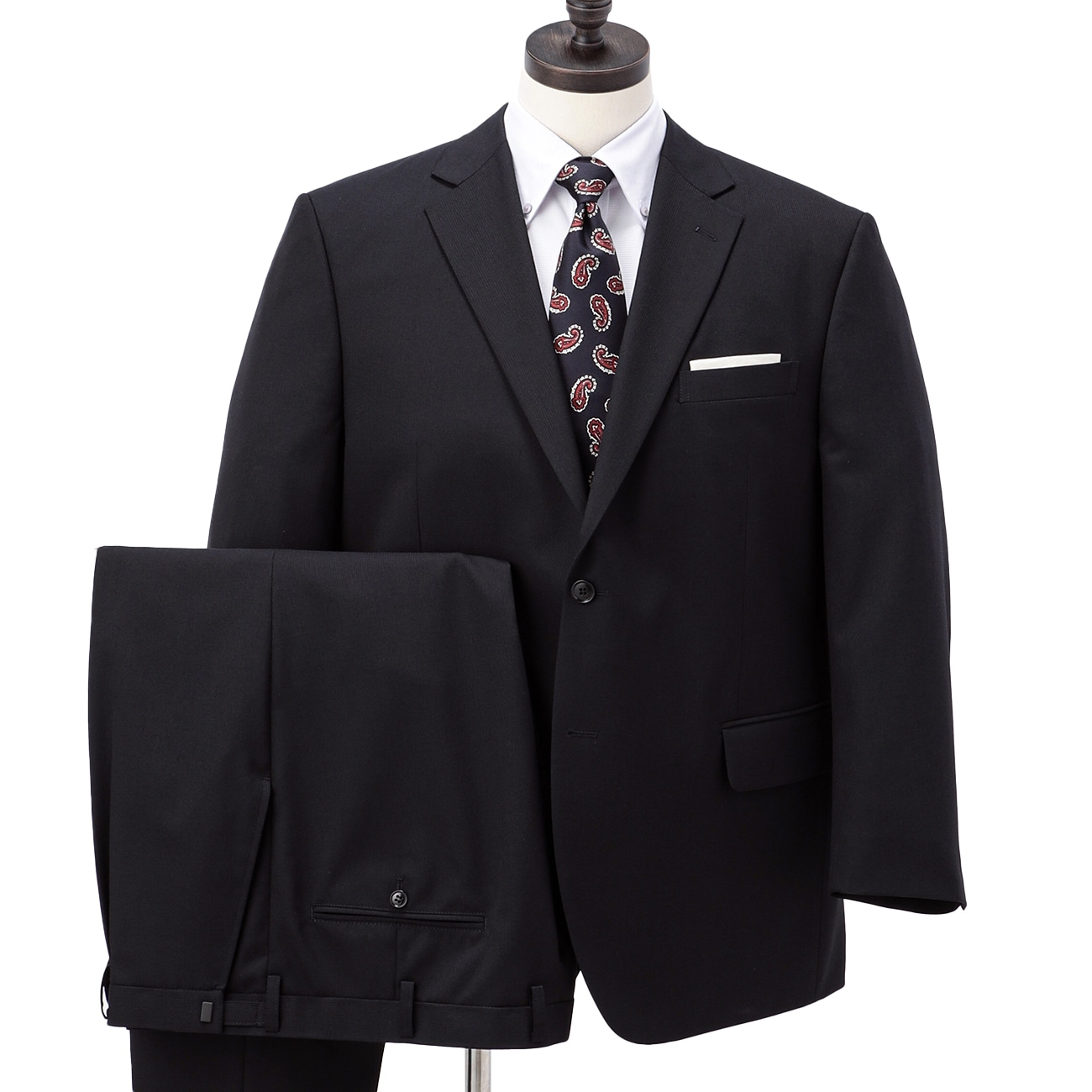 パンツアジャスター付きで快適な着心地!〇リサイクルポリエステル裏地仕様本商品の裏地には地球にプラスなエコ繊維「エコペットプラス」を使用しています。ケミカルリサイクルによって再生されたポリエステル繊維です。石油から原料を作るのに比べ、エネルギーの使用量とCO排出量を約1/5に抑えることができます。〇便利なウエストアジャスター付き左右にアジャスターが付いており、±6cmずつ、計12cm幅でウエストの調整ができます(例:ウエスト100cmの場合、94〜106cmの間で調整ができます)。〇嬉しいシロセット加工(折り目加工)付きシロセット加工(折り目加工)がついています。折り目のシャープ性が損なわれたり、きついシワが付いたりしたときは水スプレーを掛けるか、スチームアイロン掛けをしてください。-------------------- ▼仕様ジャケット:センターベント・背抜き裏地 パンツ:ワンタックパンツ・アジャスター付き本商品はベーシックシルエットです。スマートシルエットではございません。(※自社比較) ▼機能〇 洗える(洗濯機洗浄可)〇 ウエストアジャスター〇 シロセット加工(折り目加工)〇 リサイクルポリエステル裏地使用------------------※こちらは裾のお直しが必要な商品です。ミシンでの補正をご希望の場合は「お直しの選択」ボタンよりお選びください。またお急ぎの場合はアイロンで裾上げができる、裾上げテープもご用意しております。※本商品にはハンガーが付属します。保管用カバーは付属いたしませんのでご了承ください。お求めの方はこちら。こちらの商品の自社旧価格は2023.08.07〜2023.09.03の期間の販売価格となります。