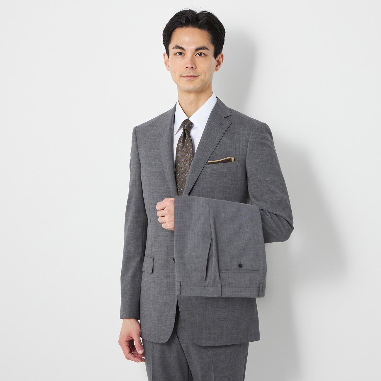 シルエットと着心地をアップデートしたLES MUES ブリティッシュスリム洗い替え用に便利な2パンツタイプストレッチで快適な動作性を実現した自宅で洗えるスーツ〇パンツが2本セットになって洗い替えに便利交互に着用することにより、パンツの痛みを軽減しスーツを長持ちさせます。〇洗えるスーツ仕事終わりに、休日に、洗濯機で簡単に洗えます。スーツは自宅で水洗いして、日々の汚れやにおい、花粉・菌・ウイルスを洗って落とし、いつでも清潔に。洗濯後もほぼアイロンがけは不要で、お手入れらくらく。〇高いストレッチ性ストレッチ性の高い素材で動きやすく快適な着心地ながらもシワに強く、きちんと見えし好印象◎〇LES MUES(レミュー)ブリティッシュスリムのこだわりポイント・首から肩にかけて、より吸いつく襟の「のぼり」が美しく着心地も良し・ラペル幅をやや細くし、よりスリムな印象に・胸囲とウエストの差寸調整により、横しわ・つっぱり感がなくなり、より綺麗な見た目に・フロントカットを広めに設定し、軽快かつウエストシェイプした印象に・パンツのヒップ周りのしわ改善を実現し、より綺麗なシルエットに--------------------▼デザインナチュラルショルダーゆるやかに流れる曲線が美しいナチュラルショルダー。極薄毛芯パットの採用と、丸く縫う縫製技術で着用感も優れています。スマートシルエット適度な肩幅、ウエストをやや細く絞ったスマートシルエットのジャケット。コンフォート仕様パンツのウエストベルトを特殊な仕様にすることで快適な着用感を実現。テーパードパンツローライズで履きやすく、股上が浅く美脚効果の高いテーパードシルエットで、エレガントな佇まいを演出。--------------------▼仕様ジャケット:AMFステッチ・センターベント・山切り背抜き・マルチポケットパンツ:ノータック・2本付き・プリーツ加工▼生地の厚さ普通▼機能〇 洗える(洗濯機洗浄可)〇 ストレッチ(表地・胴裏・袖裏・膝裏)--------------------【パンツについて】※ローライズパンツのため、お腹周りの圧迫が軽減されます。※お届け商品の付属タグに「ウエストの実寸は表示サイズより+2cmで仕上がっています」と記載がございますが、WEBページ上ではウエストサイズは元々+2cmで記載しておりますのでご安心くださいませ。※プリーツ加工...長時間の着用や雨・水に濡れた時でも折り目が消えにくくなっています。着用後に折り目が消えかかっても、霧吹きして吊り下げておくと折り目が回復してきます。さらに軽くアイロン掛けすることでより一層シャープさが増します。クリーニングの際は取扱表示をご確認の上従い、必ず元の折り目に沿ってプレスしてください。--------------------※こちらは裾のお直しが必要な商品です。ミシンでの補正をご希望の場合は「お直しの選択」ボタンよりお選びください。またお急ぎの場合はアイロンで裾上げができる、裾上げテープもご用意しております。※本商品にはハンガーが付属します。保管用カバーは付属いたしませんのでご了承ください。お求めの方はこちら。
