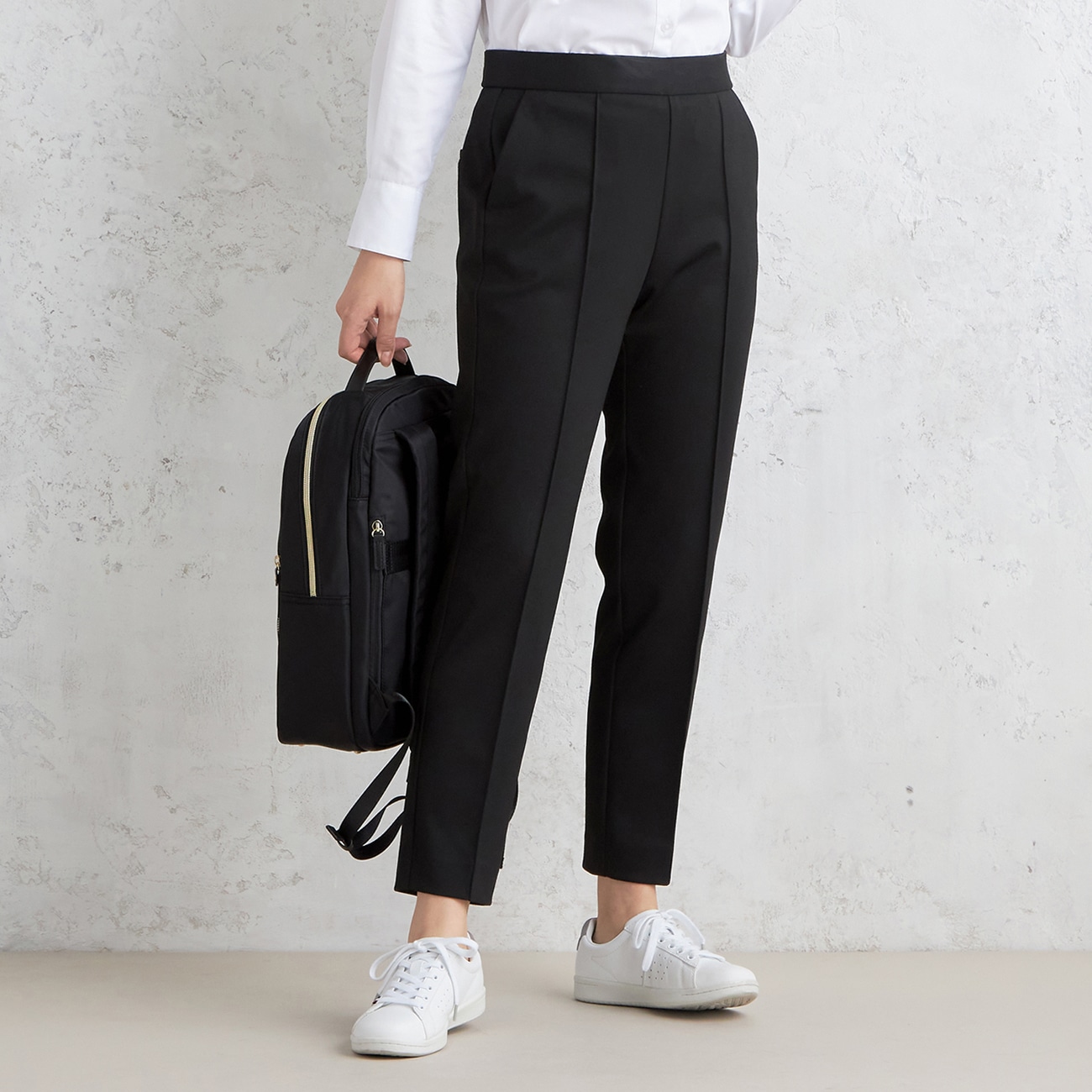 大人な雰囲気・上品仕上げのパジャマスーツ「見ためスーツ、着心地パジャマ」をコンセプトに、パジャマの快適さとスーツのフォーマルさを兼ね備えた「パジャマスーツ」シリーズ。〇すっきり・細見えを叶える万能クロップドデザイン・きちんと感のある着こなしが叶うピンタッククリースライン・サッと履くだけで程よくきれいめにキマるプルオンパンツ・別売りのジャケットとセットアップでも着用可能〇ドレッシーな印象のジャージー素材・しっかりとした厚み、程よいハリ感、しっとり落ち感が美シルエットの上品素材・ストレッチ糸を混紡し、着心地の良さも◎・経済的な自宅で洗えるウォッシャブル仕様--------------------▼仕様裏地なし、脇ポケットあり※裾上げ済のため、お裾補正なしでお召しいただけます。 股下丈については「サイズスペック」をご確認くださいませ。▼機能〇 洗える(洗濯機洗浄可)〇 ストレッチ--------------------▼セットアップシリーズ 別売り※ノーカラージャケット以外は紺・黒のみの展開です。ジャケット(ノーカラー):品番23WLWLJK1ジャケット(テーラード):品番23WLWLJK2スカート:品番23WLWLSK1パンツ(ワイド):品番23WLWLPT2--------------------▼スタッフ着用コメント@身長156cm 普段のサイズ:M〜L/本商品着用サイズ:Lスタッフコーデはこちら「ももはり体型ですがMでジャストサイズでした。2023年の春夏商品(ナイロンポンチ)と比べて、サイズスペックは股上のみ-1.0cmですが生地感が春夏より厚くなった為か、よりぴったりした着心地に感じました。普段私服がMサイズ→Mサイズ。MとL両方でL多め→Lがお勧めのサイズ感です。股上も浅くなった感じもなく、安心感のある履き心地。前に入ったラインが美脚効果ありです◎」A身長159cm 普段のサイズ:S/本商品着用サイズ:Mスタッフコーデはこちら「ヒップラインを拾いたくないのでいつもより1つ大きいサイズを着用しています。ウエストが少しだけ緩いですが内側についた紐を結んで調整できます!締め付けなどはなく とても着やすい◎サイドポケット付き。後ろはダミー。」B身長162cm 普段のサイズ:M/本商品着用サイズ:Mスタッフコーデはこちら「ウエスト→普段のサイズでちょうどいい(今までのパジャマスーツより少し細め) 股上→やや深め もも周り→いつもと同じくらい 膝下→裾幅細めテーパード形 裾→裾上げなしでくるぶし半分隠れるくらい(身長162cm)」--------------------