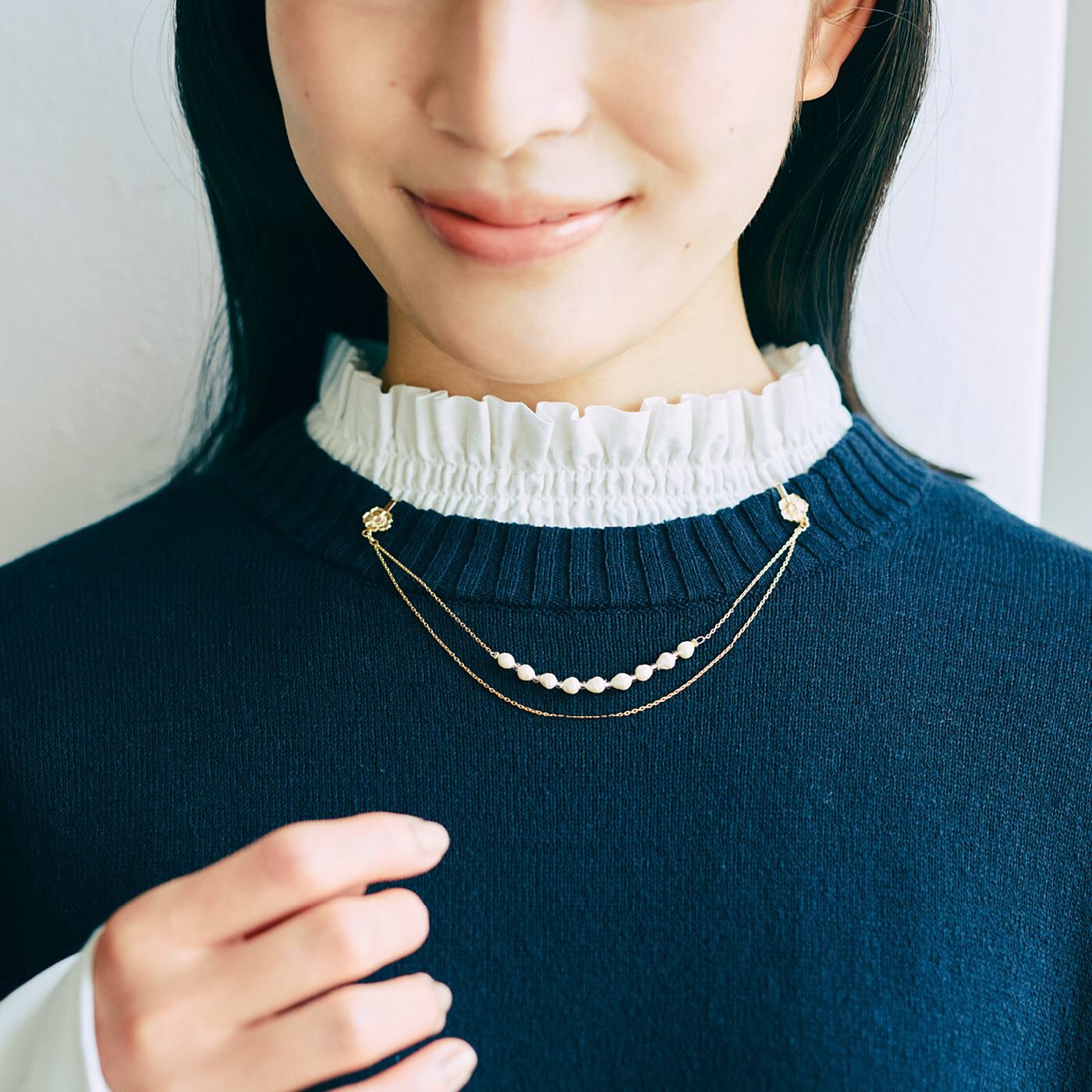 クリップで留めるだけ! シンプルなTシャツも一気に着映え汗ばむ夏、金属製のネックレスが首に当たるとかゆくて......そんな肌弱さんにおすすめなのが、直接肌に着けず、ラウンドネックの衿もとに簡単装着できる技ありネックレス。繊細な二連のチェーンにパールモチーフや天然石がきらめく大人のデザイン。合わせるだけで胸もとがぐんと華やぎます。
