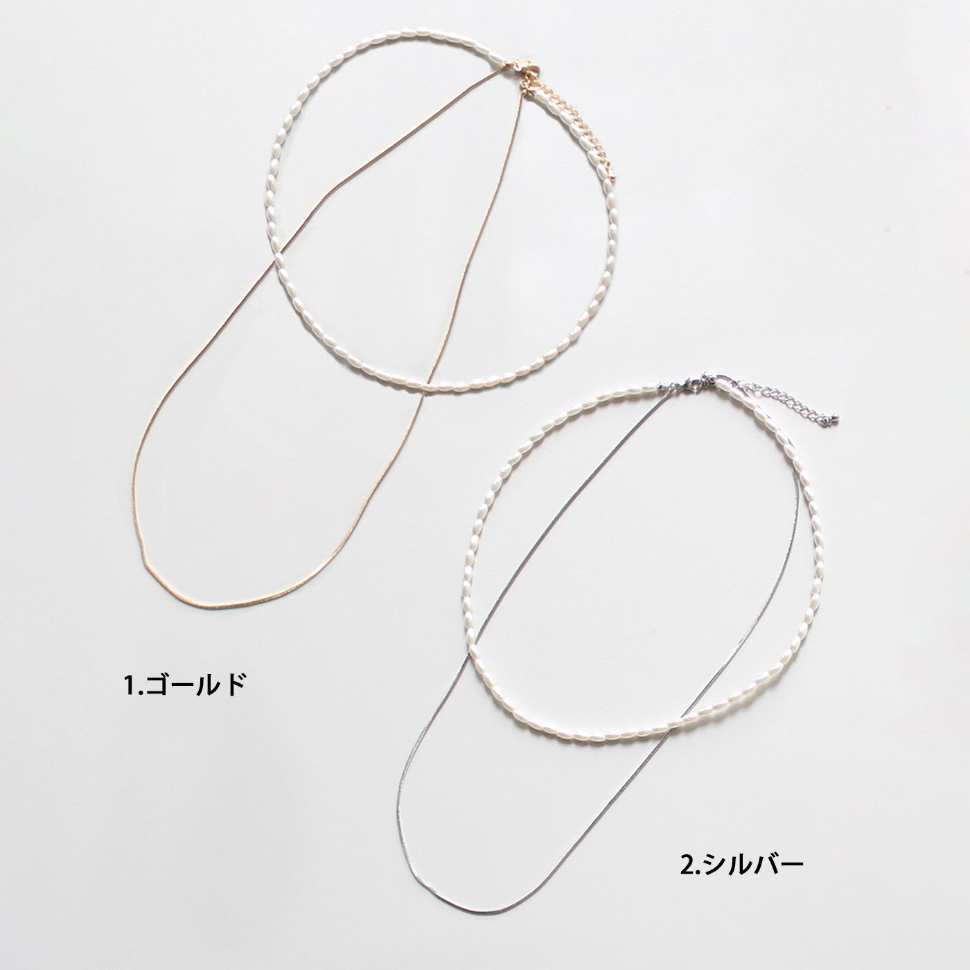ライスパールビーズが上品な2連ネックレスパールビーズとチェーンの2連になったネックレスは上品な印象ながらカジュアルダウンすることもできるのでとても便利なネックレス。〈ゴールド〉、〈シルバー〉の2色の中からお選びください。