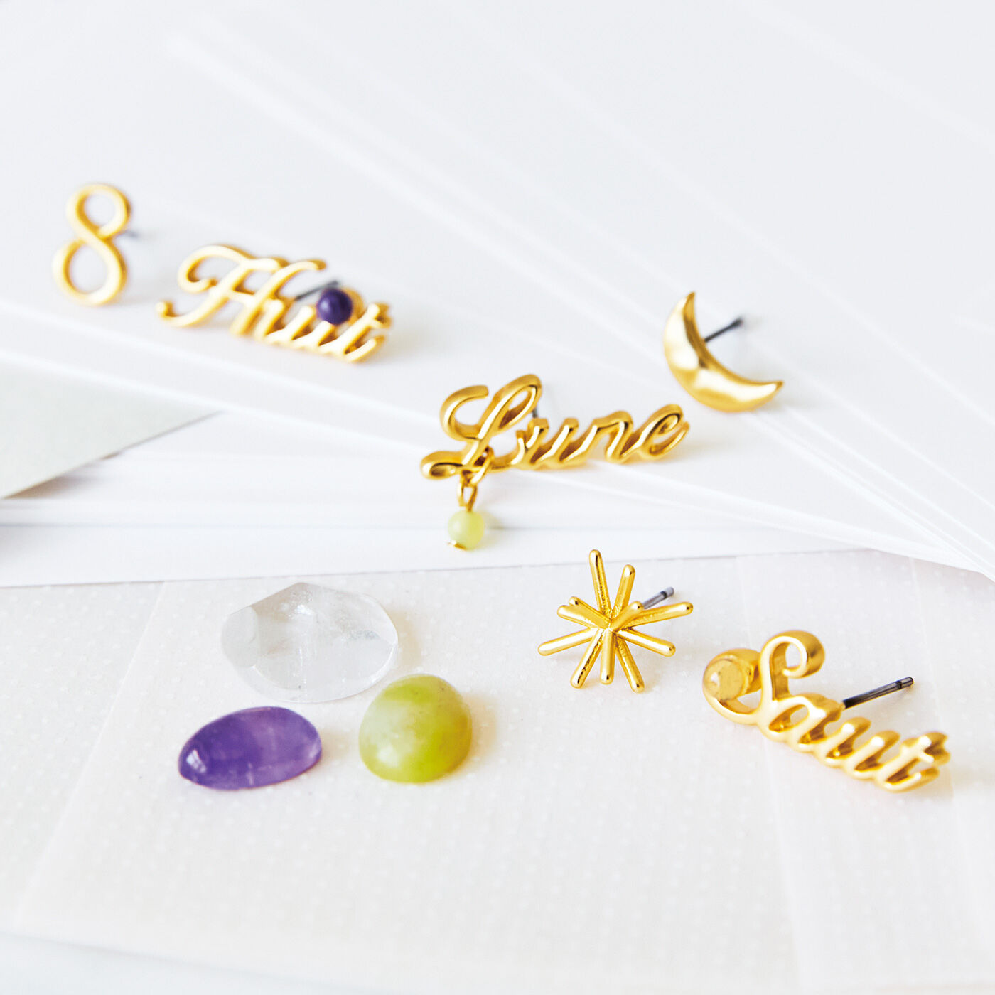 気分を上げてくれる、耳もとにきらめくお守り。片方はフランス語のメッセージと天然石、もう片方はメッセージにまつわるモチーフの組み合わせ。大人っぽいマットな14金メッキに小さな天然石がきらめいて、横顔を印象的に彩ります。その日の気分に合った言葉を選んで、お守りみたいに身に着けて。