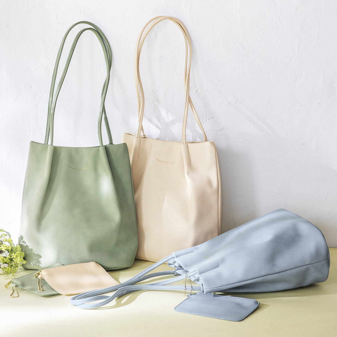 肩にゆったり トートひとつで美人見え。大人気の長い持ち手のショルダートートが、縦型でサイズが大きくなってリニューアル!しかもおそろいのカードケースも付いてきます。さわやかなカラーのしっとり本革ライクな素材感で、肩に掛ければ上品なたたずまい。メインの荷物はバッグに入れて、細かい小物はカードケースへ仕分けると便利です。在宅ワークが増えて、書類などの持ち帰りの荷物が増えた人にもおすすめです。