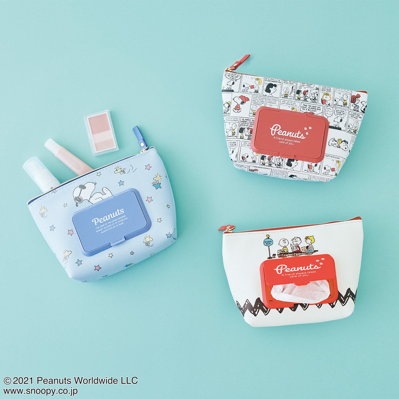 シートケースとポーチが一体化スヌーピーと仲間たちのデザインのウェットティッシュと小物をセットで携帯できるポーチ。ウェットティッシュの乾燥を防ぎながら、使うときは外からシュッと引き出せます。コスメやお菓子を入れたり、収納力もおまかせを。