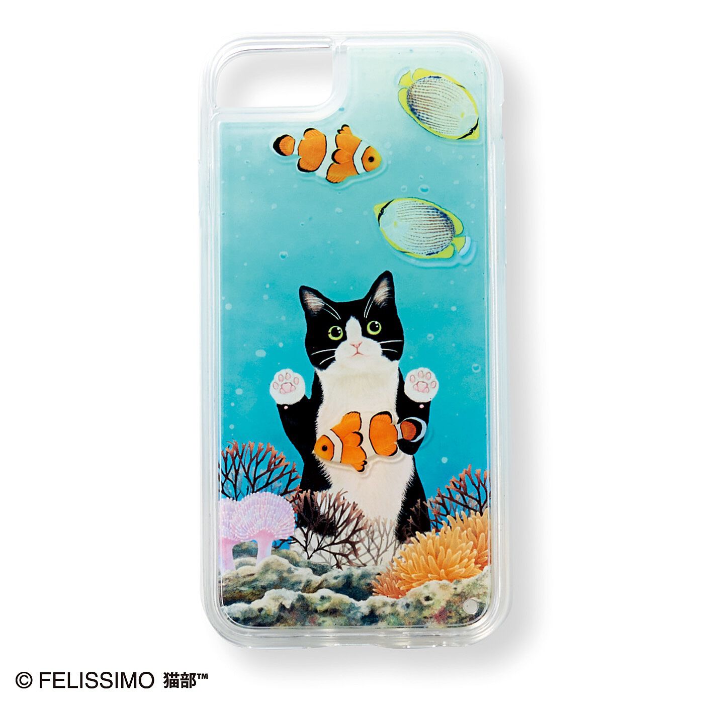 おいしそうだニャー 水槽をのぞく猫のリキッドスマホケース〈ハチワレ〉【送料: 450円+税】