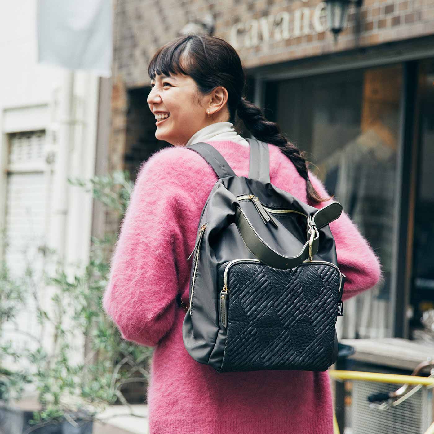 リュックが肩掛けショルダーに大変身!今年の春は身軽にデイリー使いに大活躍するリュックが、ひもをすっと引っ張るだけで肩掛けショルダーバッグに。お出かけ先でリュックを下ろしたいときも、スマートに持ちやすく変身します。コンパクトながら、500mlのペットボトルが入る頼れる容量。3つのポケットで小物を整理でき、毎日便利に使えます。