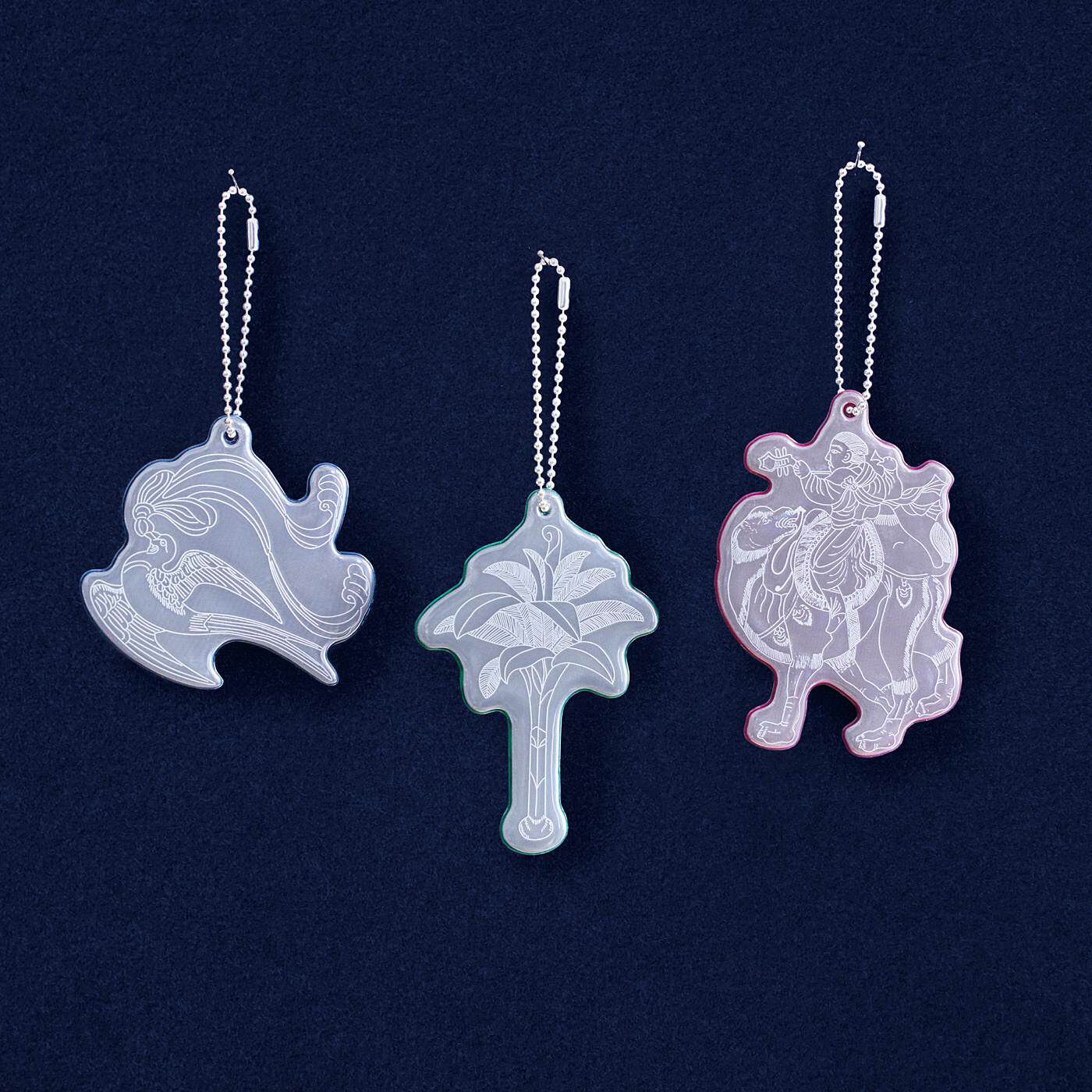 悠久の時を超えて螺鈿(らでん)級のきらめきを現代に正倉院の宝物、模造 螺鈿紫檀五絃琵琶に装飾された螺鈿のモチーフを、精密なプリントで再現したリフレクターチャーム。螺鈿の美しさを、1300年の時を超えて暮らしの中によみがえらせました。車のライトなどが当たるときらりと反射して、ドライバーにお知らせ。バッグや自転車のカギなどに付けて、お出かけいただくと、夜道の安全をサポートします。
