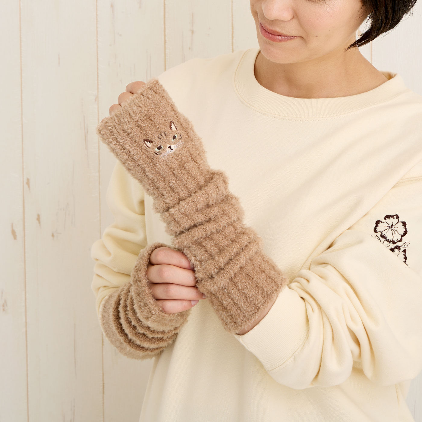 わんにゃんがぬくもりと癒やしをくれるウォーマー登場毎年人気のわんにゃん刺しゅうのシリーズに、ほわほわのアームウォーマーが仲間入り。親指ホール付きで手の甲まですっぽり、指先は出ているのでスマホの操作もしやすく、チケットやコインなどの小物も難なく扱えます。コートの袖からのぞかせてもかわいいし、パソコン作業の時に冷える手を温めるのにもいいですね。手の甲の刺しゅうをみるたび癒やされそう。