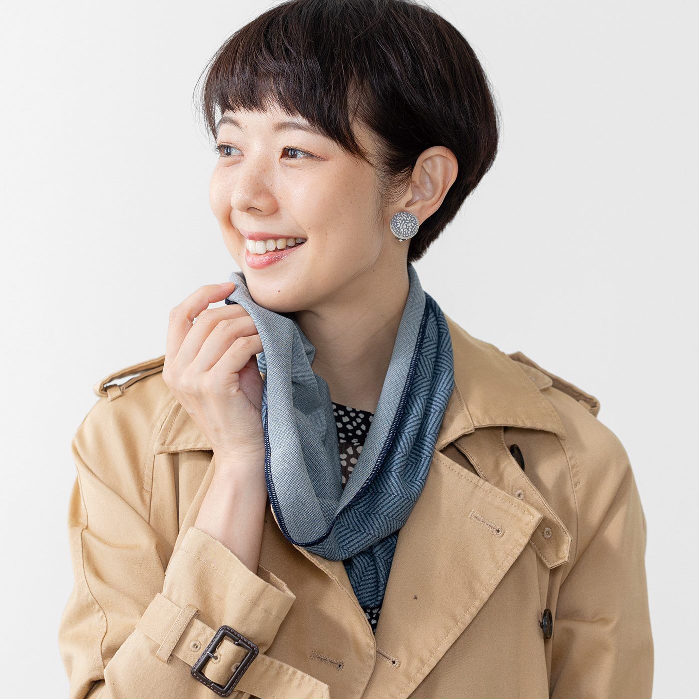 肌側シルクで気持ちよく かぶるだけでサマになる季節の変わり目の体温調節にストールが便利だけど、子連れのときにほどけやすいものはNG。ということで、リングストールを作りました。真ん中にナイロン、内側にシルク、外側に綿が出る編み地でやわらかな肌当たりがいいんです。走りながらでもパッとかぶれば装着できて、ほどよいボリュームで決まります。ヘリンボーンの編み柄がコーデのアクセントにも。通年で使えてしわになりにくい素材感なので、365日バッグにIN!