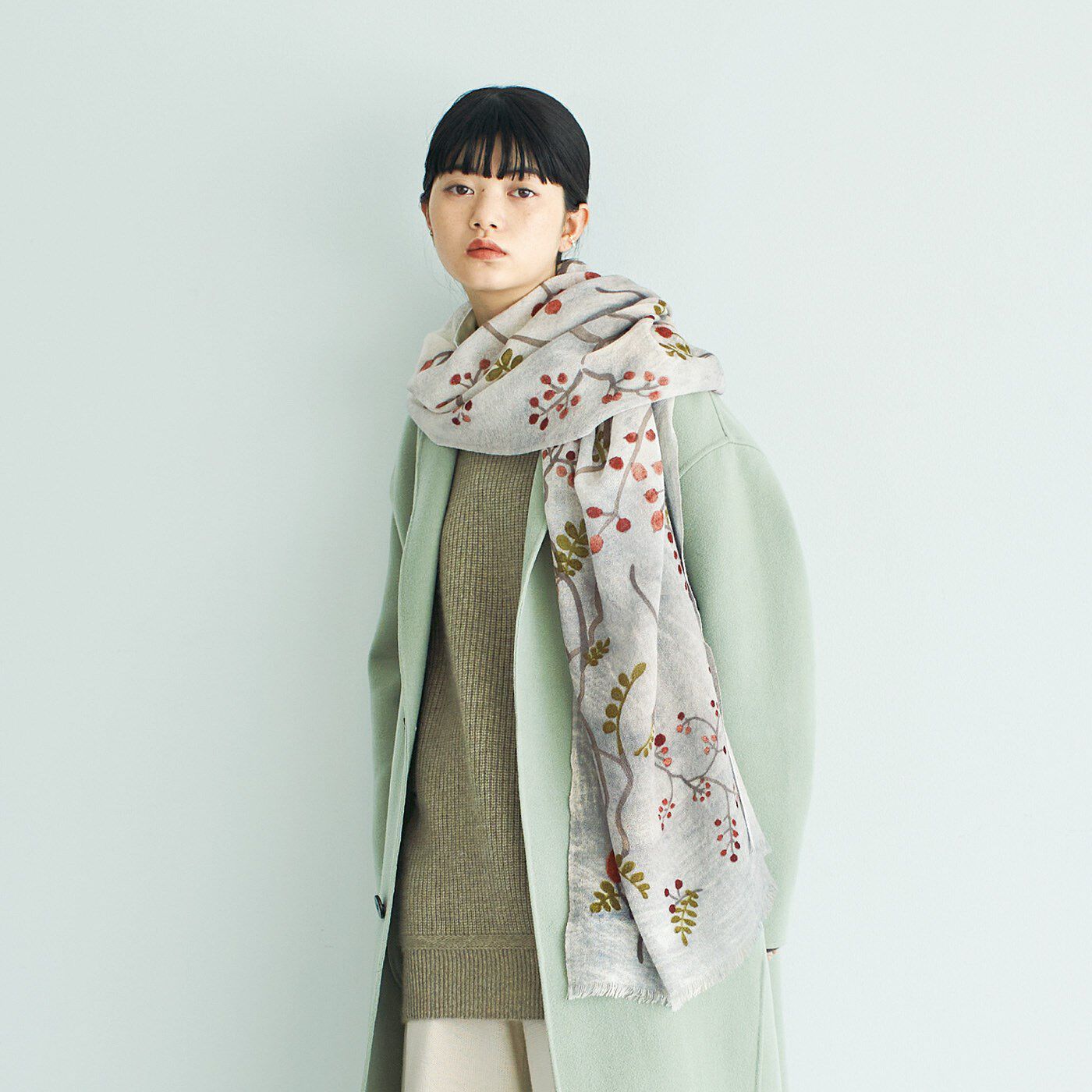 水彩画をまとう ウール100%ストール山本 祐布子さんが描く暮らしの中の身近な植物を、ウール100%のプリントストールに。色の濃淡や筆のタッチなど水彩による原画の豊かな味わいを、できるだけ忠実に再現しました。甘く織り上げることで、空気を含んだふわりと軽く暖かで、ウールですがちくちくしにくい肌心地。冬はふわりと暖かく、春も軽やかに冷え対策ができ、オールシーズン活躍します。薄手で巻くとほどよいボリュームが生まれてこなれた印象に、持ち歩くときはコンパクトになりバッグに収納しやすいのも魅力です。自然の中に咲くようなタイプの様々な種類のバラの実を描いた「バラの実」、細い茎に華やかに花をつける、芍薬、ラナンキュラス、ポピー、チューリップを反転しながら中央に向かって咲いているようなレイアウトの「お花」、それぞれのハーブの名前を植物採集図鑑的に添えた「ハーブ」と、それぞれ印象が違う3柄を、ぜひ集めて日々の装いに自然の華やぎを。