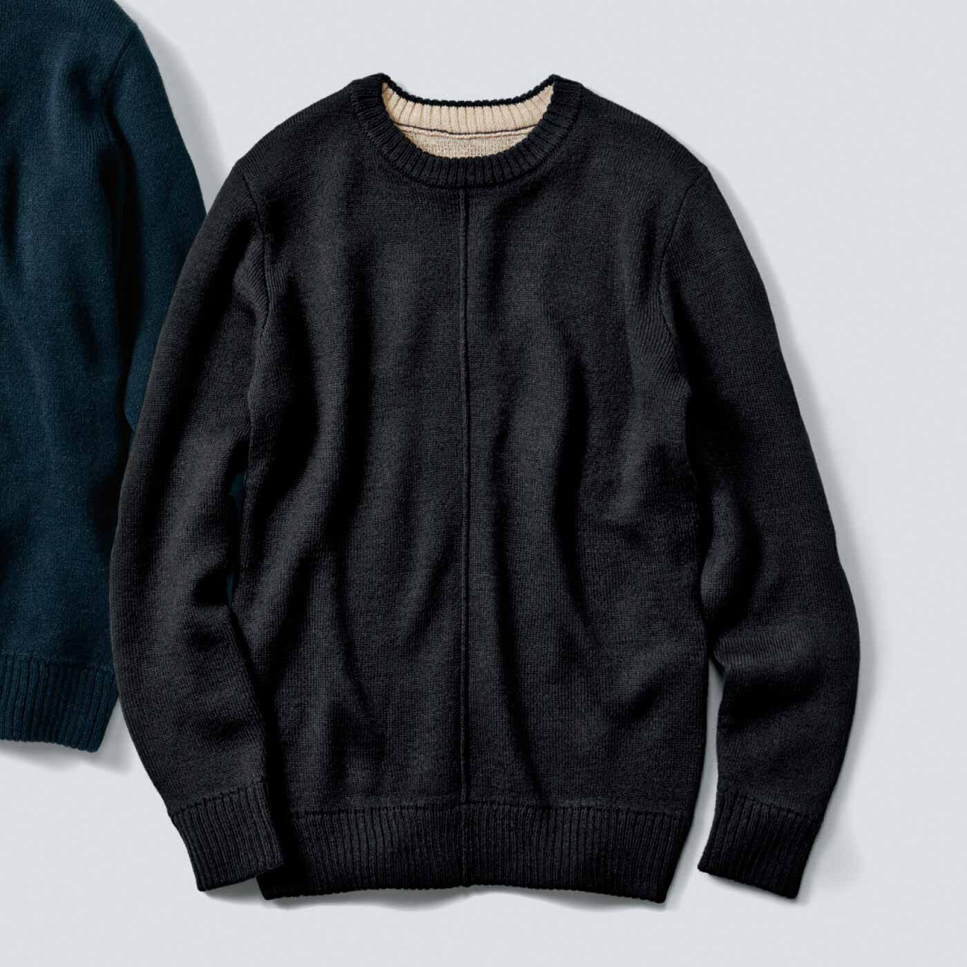 やさしく暖かな着心地も大好評、ハンサムニットに新色の黒が登場。【3つで\6,666】キャンペーン対象商品3点以上で特別価格\2,222外側はウォーム感のあるウール・アルパカ混、肌にふれる内側は綿100%のダブルフェイスで編み上げました。シンプルなクルーネックに、つかず離れずのシルエットやフロントシームでアクセントをきかせて、こなれ見えも実現。チクチク感を気にせず、暖かさと肌心地のよさを両立させながら、格好よく着こなせる一枚です。