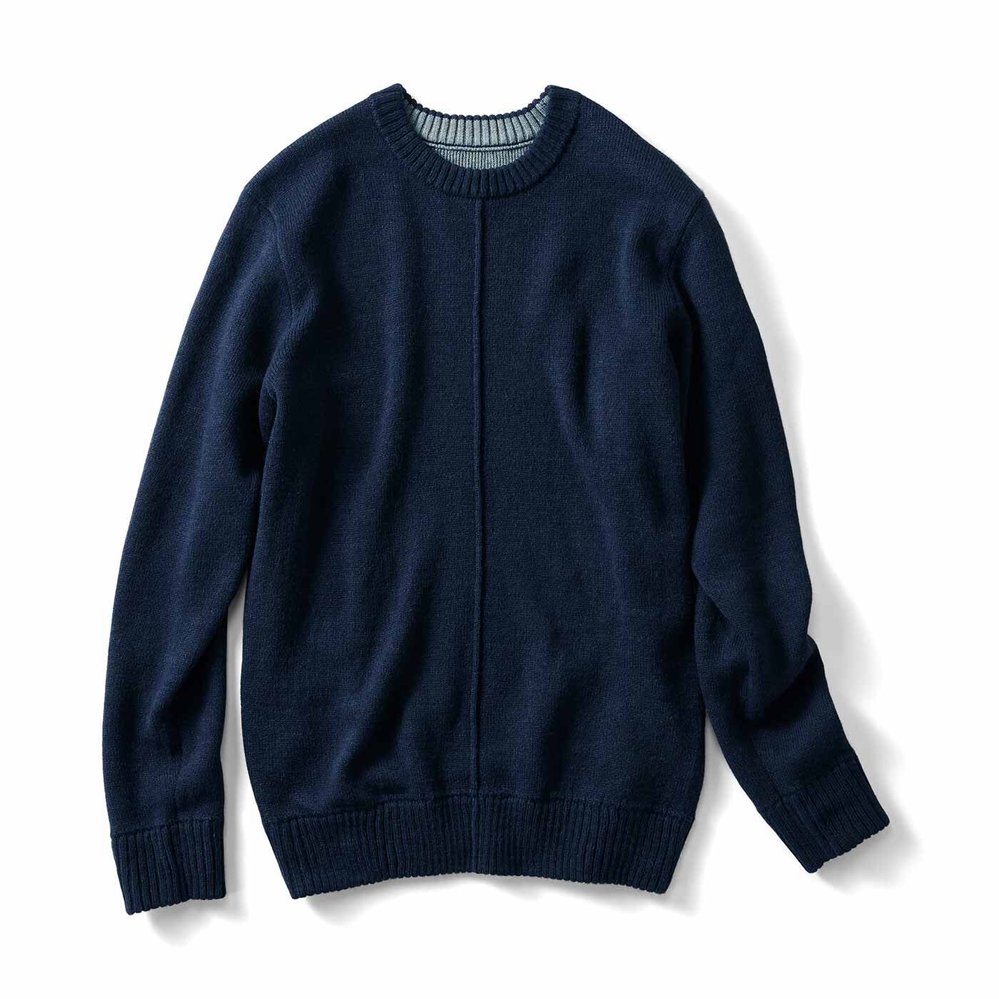 IEDIT[イディット] 内側コットン&表アルパカ混素材のダブルフェイス編みラウンドネック メンズニット〈ダークネイビー〉【送料無料】