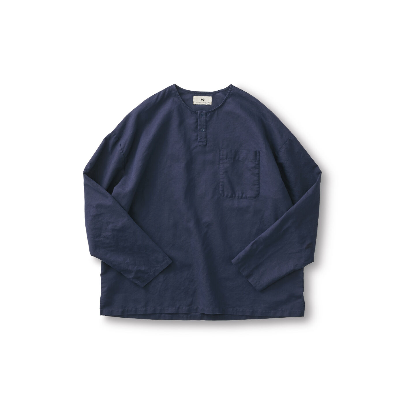 Tシャツみたいなシャツ。ちょっと大人なTシャツ感覚で着られる「ヘンリーネックトップス」は、シンプルなデザインのヘンリーネックトップスを綿麻の生地で仕立てました。前立てはスナップボタンで軽く仕上げています。ちょうどいい厚さの生地を作っているので、夏の終わりから長く活躍してくれます。