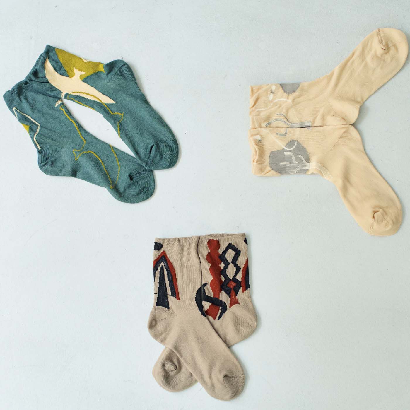 樹木と動物たちの、おだやかな時間「木々と動物たちが自然の中で融合している、心地よい時間を描きました」そう話してくれたのは、靴下のモチーフをデザインしてくださった、平澤まりこさん。ぐるりと配した図柄は角度によって見え方が変わり、まるでアートのよう。平澤さんがセレクトした洗練された色遣いにも心躍ります。肌側は滑らかなシルク糸を使用して、うっとりする肌ざわりに。二重編みにすることで糸渡りが肌に当たらず、ちくちくしないはき心地です。
