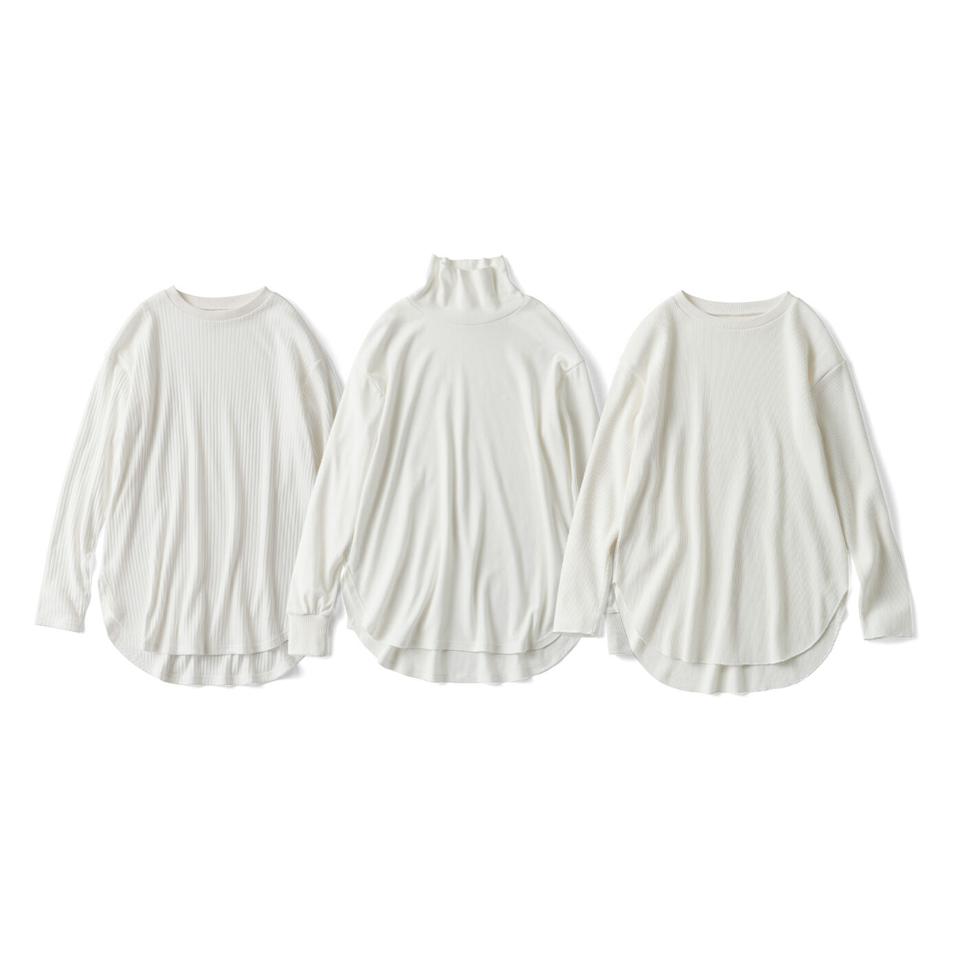 ワッフル、スムース、太めリブ 着映えも備えた3つのほか綿。ラウンドした長めのすそが冬の重ね着スタイルに活躍するトップスを、やさしく暖かいほか綿仕立てで。一枚でも着られるほどよい厚み & シルエットで、生地感や衿もとも表情豊かだから、3枚集めて毎日活躍させて。