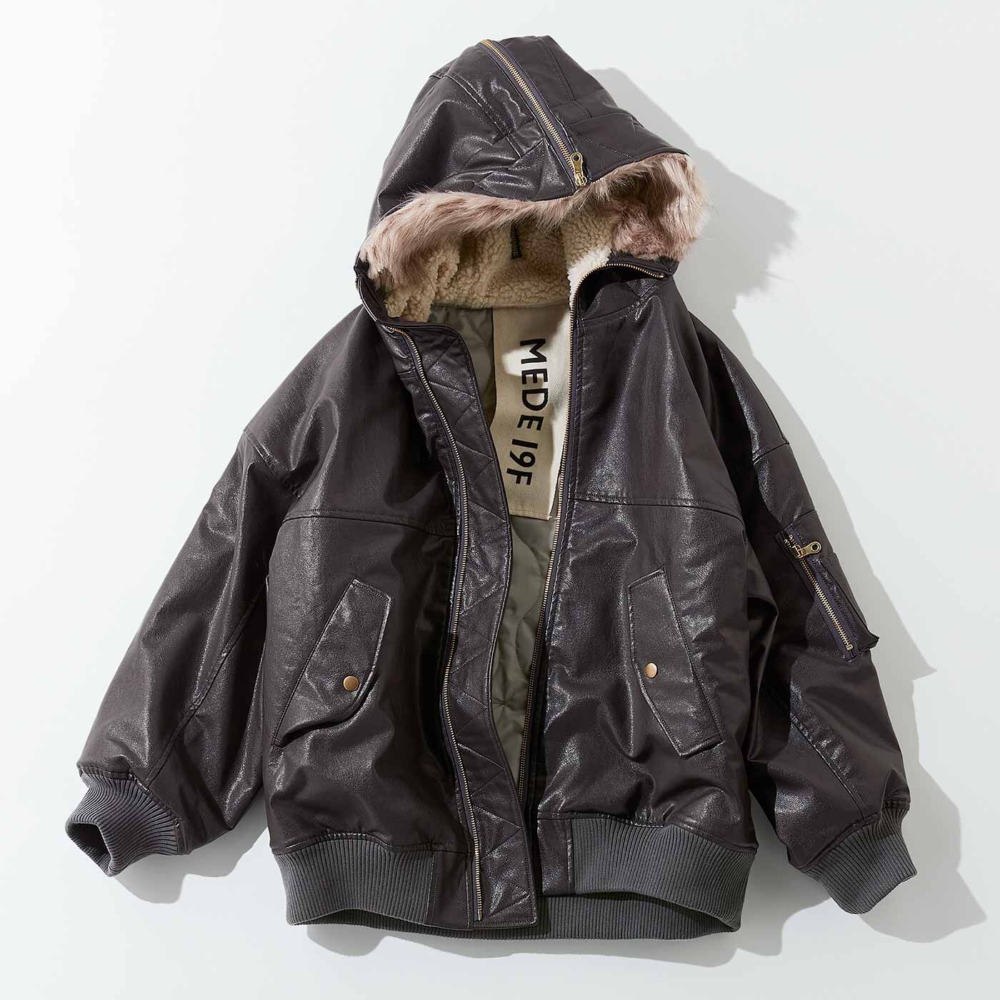 ヘヴィーなアイテムを、フェイクレザーで軽くN-2Aフライトジャケットをベースに、MEDE19F流の素材アレンジで仕上げたフェイクレザーブルゾンです。あえて、オーバーサイズに仕上げることで、存在感のある一着に。カラーは少し赤みのあるチャコールグレー。内側は中わた入りのキルティング素材で、防寒性を高めました。毛足の長いフェイクファーで縁取った存在感のあるフードは、ジッパーによる開閉仕様。開くと見える内側のボアもポイントに。後ろ姿にもこだわりました。