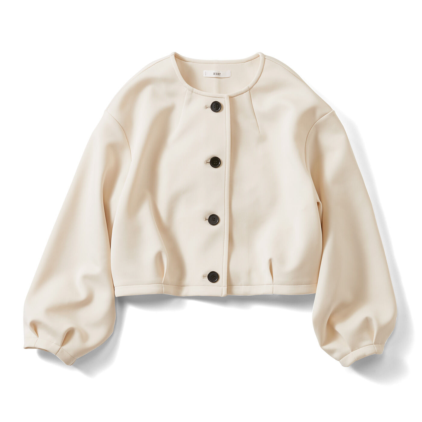 甘さのあるレトロなデザインもモノトーンなら大人っぽい。はおりとして重宝するショート丈ジャケットを、新鮮な気分でまとえるコロンと丸いノーカラーで仕立てました。ダーツを入れて詰まった衿に、ほの甘いドロップショルダーが上品。身幅はゆったり、すそにタックを寄せてふんわりと構築的に仕上げているので着映え感もたっぷりです。しわになりにくい素材で、お手入れもらくちん。モダンな配色のボタンがコーデを引き締めてくれます。