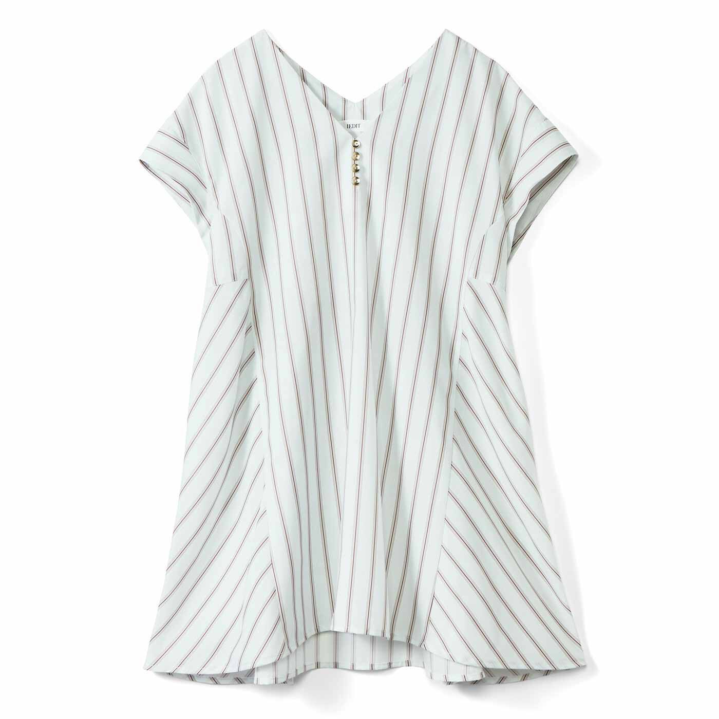 風通る細見えブラウスで夏コーデの鮮度と清涼感UP!シンプルすぎたり、まじめすぎたり、マンネリがちな夏のお仕事スタイルが、ふわりとあか抜けるブラウスは、美しいシルエットがポイント。切り替えとギャザーを巧みに効かせた後ろ下がりのフォルムは、ゆったりリラクシー。それでいて、サイドを斜めに配したストライプの視覚効果や、フロントのVネックがすっきり見えるから、スタイルアップがかないます。フロントのボタンも上品なアクセント。